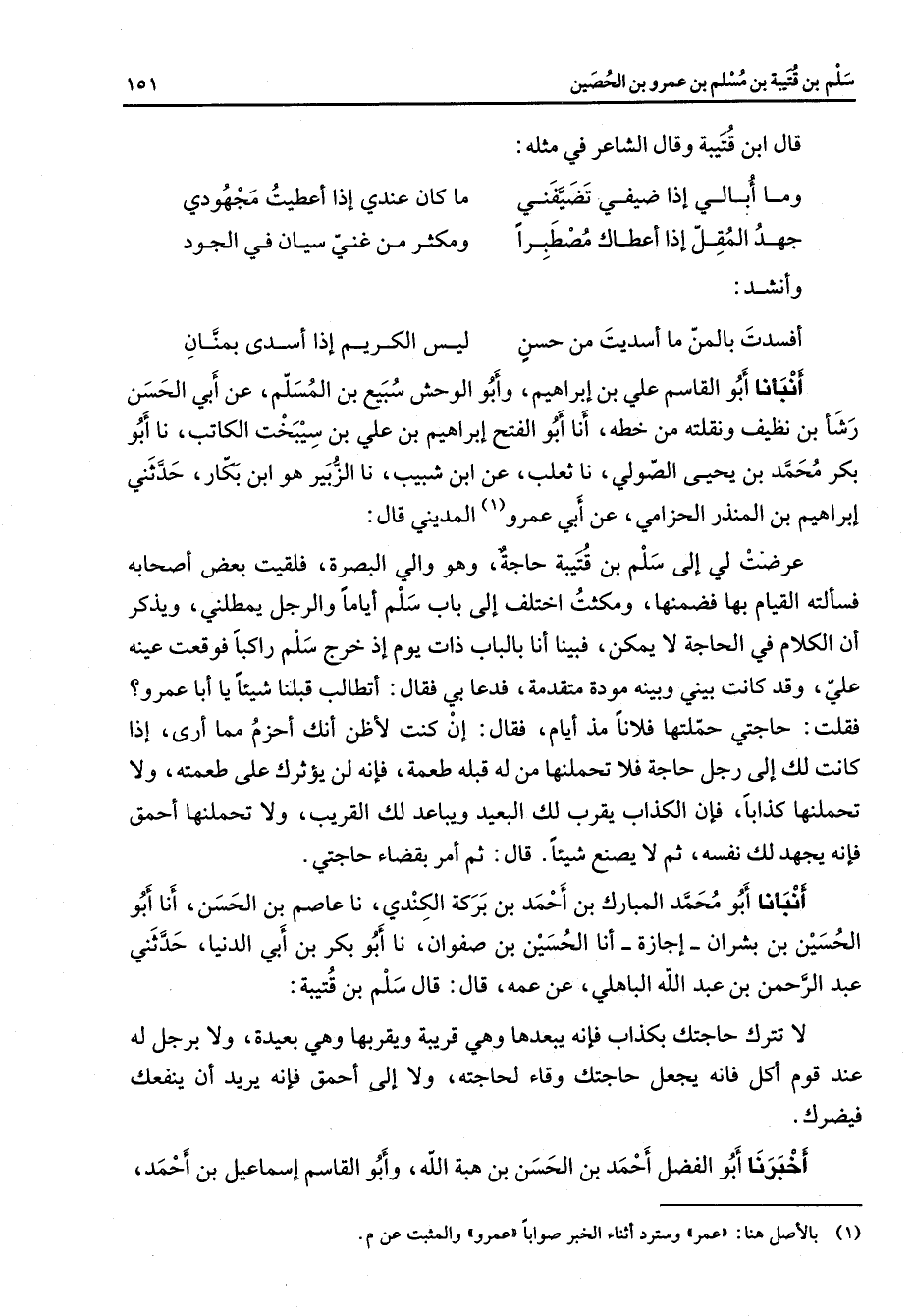 قال ابن قتيبة وقال الشاعر في مثله * وما أبالي إذا ضيفي تضيفني * ما كان عندي إذا أعطيت مجهودي جهد المقل إذا أعطاك مصطبرا * ومكثر من غني سيان في الجود * وأنشد * أفسدت بالمن ما أسديت من حسن * ليس الكريم إذا أسدى بمنان * أنبأنا أبو القاسم علي بن إبراهيم وأبو الوحش سبيع بن المسلم عن أبي الحسن رشأ بن نظيف ونقلته من خطه أنا أبو الفتح إبراهيم بن علي بن سيبخت الكاتب نا أبو بكر بن محمد بن يحيى الصولي نا ثعلب عن ابن شبيب نا الزبير هو ابن بكار حدثني إبراهيم بن المنذر الحزامي عن أبي عمرو (1) المديني قال عرضت لي إلى سلم بن قتيبة حاجة وهو والي البصرة فلقيت بعض أصحابه فسألته القيام بها فضمنها ومكثت اختلف إلى باب سلم أياما والرجل يمطلني ويذكر أن الكلام في الحاجة لا يمكن فبينا أنا بالباب ذات يوم إذ خرج سلم راكبا فوقعت عينه علي وقد كانت بيني وبينه مودة متقدمة فدعا بي فقال أتطالب قبلنا شيئا يا أبا عمرو فقلت حاجتي حملتها فلانا مذ أيام فقال إن كنت لأظن أنك أحزم مما أرى إذا كانت لك إلى رجل حاجة فلا تحملنها من له قبله طعمة فإنه لن يؤثرك على طعمته ولا تحملنها كذابا فإن الكذاب يقرب لك البعيد ويباعد لك القريب ولا تحملنها أحمق فإنه يجهد لك نفسه ثم لا يصنع شيئا قال ثم أمر بقضاء حاجتي أنبأنا أبو محمد المبارك بن أحمد بن بركة الكندي نا عاصم بن الحسن أنا أبو الحسين بن بشران إجازة أنا الحسين بن صفوان نا أبو بكر بن أبي الدنيا حدثني عبد الرحمن بن عبد الله الباهلي عن عمه قال قال سلم بن قتيبة لا تترك حاجتك بكذاب فإنه يبعدها وهي قريبة ويقربها وهي بعيدة ولا برجل له عند قوم أكل فانه يجعل حاجتك وقاء لحاجته ولا إلى أحمق فإنه يريد أن ينفعك فيضرك أخبرنا أبو الفضل أحمد بن الحسن بن هبة الله وأبو القاسم إسماعيل بن أحمد