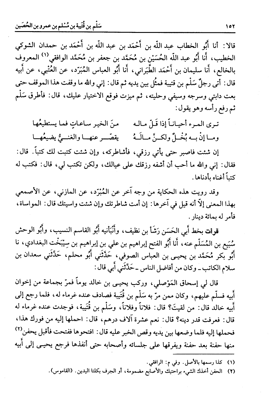 قالا أنا أبو الخطاب عبد الله بن أحمد بن عبد الله بن أحمد بن حمدان الشوكي الخطيب أنا أبو عبد الله الحسين بن محمد بن جعفر بن محمد الوافقي (1) المعروف بالخالع أنا سليمان بن أحمد الطبراني أنا أبو العباس المبرد عن العتبي عن أبيه قال أتى رجل سلم بن قتيبة فمثل بين يديه ثم قال إني والله ما وقفت هذا الموقف حتى بعت دابتي وسرجه وسيفي وحليته ثم ميزت فوقع الاختيار عليك قال فأطرق سلم ثم رفع رأسه وهو يقول * ترى المرء أحيانا إذا قل ماله * من الخير ساعات فما يستطيعها وما إن به بخل ولكن ماله * يقصر عنها والغني يضيعها * إن شئت فاصبر حتى يأتي رزقي فأشاطركه وإن شئت كتبت لك كتبا قال فقال إني والله ما أحب أن أشفه رزقك على عيالك ولكن تكتب لي قال فكتب له كتبا أغناه بأدناها وقد رويت هذه الحكاية من وجه آخر عن المبرد عن المازني عن الأصمعي بهذا المعنى إلا أنه قيل في آخرها إن أمت شاطرتك وإن شئت واسيتك قال المواساة فأمر له بمائة دينار قرأت بخط أبي الحسن رشأ بن نظيف وأنبأنيه أبو القاسم النسيب وأبو الوحش سبيع بن المسلم عنه أنا أبو الفتح إبراهيم بن علي بن إبراهيم بن سيبخت البغدادي نا أبو بكر محمد بن يحيى بن العباس الصوفي حدثني أبو محلم حدثني سعدان بن سلام الكاتب وكان من أفاضل الناس حدثني أبي قال قال لي إسحاق الموصلي وركب يحيى بن خالد يوما فمر بجماعة من إخوان أبيه فسلم عليهم وكان ممن مر به سلم بن قتيبة فصادف عنده غرماء له فلما رجع إلى أبيه خالد قال من لقيت قال فلانا وفلانا وسلم بن قتيبة فوجدت عنده غرماء له قال فعرفت قدر دينه قال نعم عشرة آلاف درهم قال احملها إليه من فورك هذا فحملها إليه فلما وضعها بين يديه وقص الخبر عليه قال افتحوها ففتحت فأقبل يحفن (2) منها حفنة بعد حفنة ويفرقها على جلسائه وأصحابه حتى أنفذها فرجع يحيى إلى أبيه