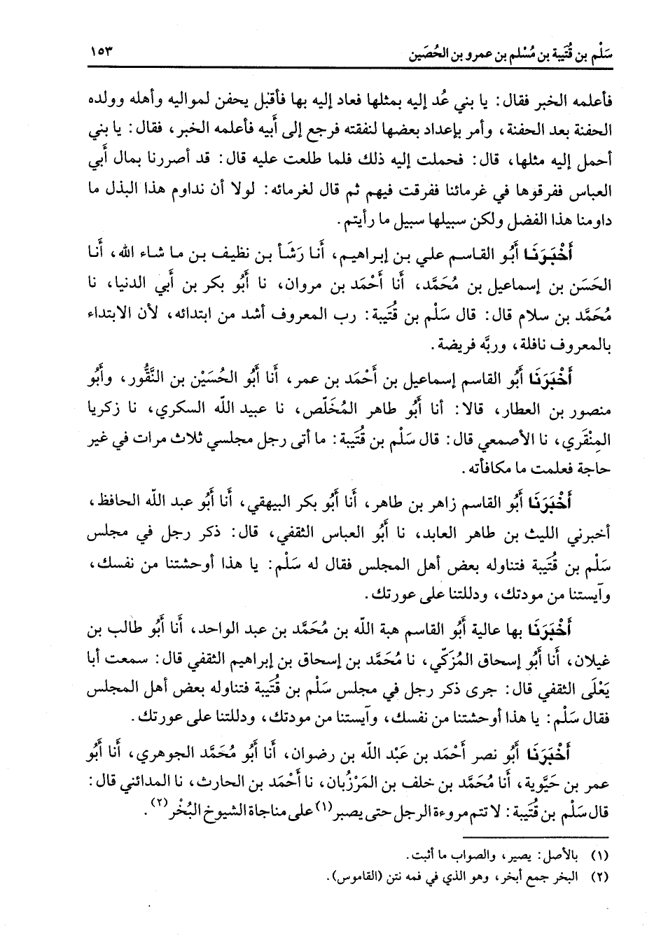 فأعلمه الخبر فقال يا بني عد إليه بمثلها فعاد إليه بها فأقبل يحفن لمواليه وأهله وولده الحفنة بعد الحفنة وأمر بإعداد بعضها لنفقته فرجع إلى أبيه فأعلمه الخبر فقال يا بني أحمل إليه مثلها قال فحملت إليه ذلك فلما طلعت عليه قال قد أصررنا بمال أبي العباس ففرقوها في غرمائنا ففرقت فيهم ثم قال لغرمائه لولا أن نداوم هذا البذل ما داومنا هذا الفضل ولكن سبيلها سبيل ما رأيتم أخبرنا أبو القاسم علي بن إبراهيم أنا رشأ بن نظيف بن ما شاء الله أنا الحسن بن إسماعيل بن محمد أنا أحمد بن مروان نا أبو بكر بن أبي الدنيا نا محمد بن سلام قال قال سلم بن قتيبة رب المعروف أشد من ابتدائه لأن الابتداء بالمعروف نافلة وربه فريضة أخبرنا أبو القاسم إسماعيل بن أحمد بن عمر أنا أبو الحسين بن النقور وأبو منصور بن العطار قالا أنا أبو طاهر المخلص نا عبيد الله السكري نا زكريا المنقري نا الأصمعي قال قال سلم بن قتيبة ما أتى رجل مجلسي ثلاث مرات في غير حاجة فعلمت ما مكافأته أخبرنا أبو القاسم زاهر بن طاهر أنا أبو بكر البيهقي أنا أبو عبد الله الحافظ أخبرني الليث بن طاهر العابد نا أبو العباس الثقفي قال ذكر رجل في مجلس سلم بن قتيبة فتناوله بعض أهل المجلس فقال له سلم يا هذا أوحشتنا من نفسك وآيستنا من مودتك ودللتنا على عورتك أخبرنا بها عالية أبو القاسم هبة الله بن محمد بن عبد الواحد أنا أبو طالب بن غيلان أنا أبو إسحاق المزكي نا محمد بن إسحاق بن إبراهيم الثقفي قال سمعت أبا يعلى الثقفي قال جرى ذكر رجل في مجلس سلم بن قتيبة فتناوله بعض أهل المجلس فقال سلم يا هذا أوحشتنا من نفسك وآيستنا من مودتك ودللتنا على عورتك أخبرنا أبو نصر أحمد بن عبد الله بن رضوان أنا أبو محمد الجوهري أنا أبو عمر بن حيوية أنا محمد بن خلف بن المرزبان نا أحمد بن الحارث نا المدائني قال قال سلم بن قتيبة لا تتم مروءة الرجل حتى يصبر (1) على مناجاة الشيوخ البخر (2)