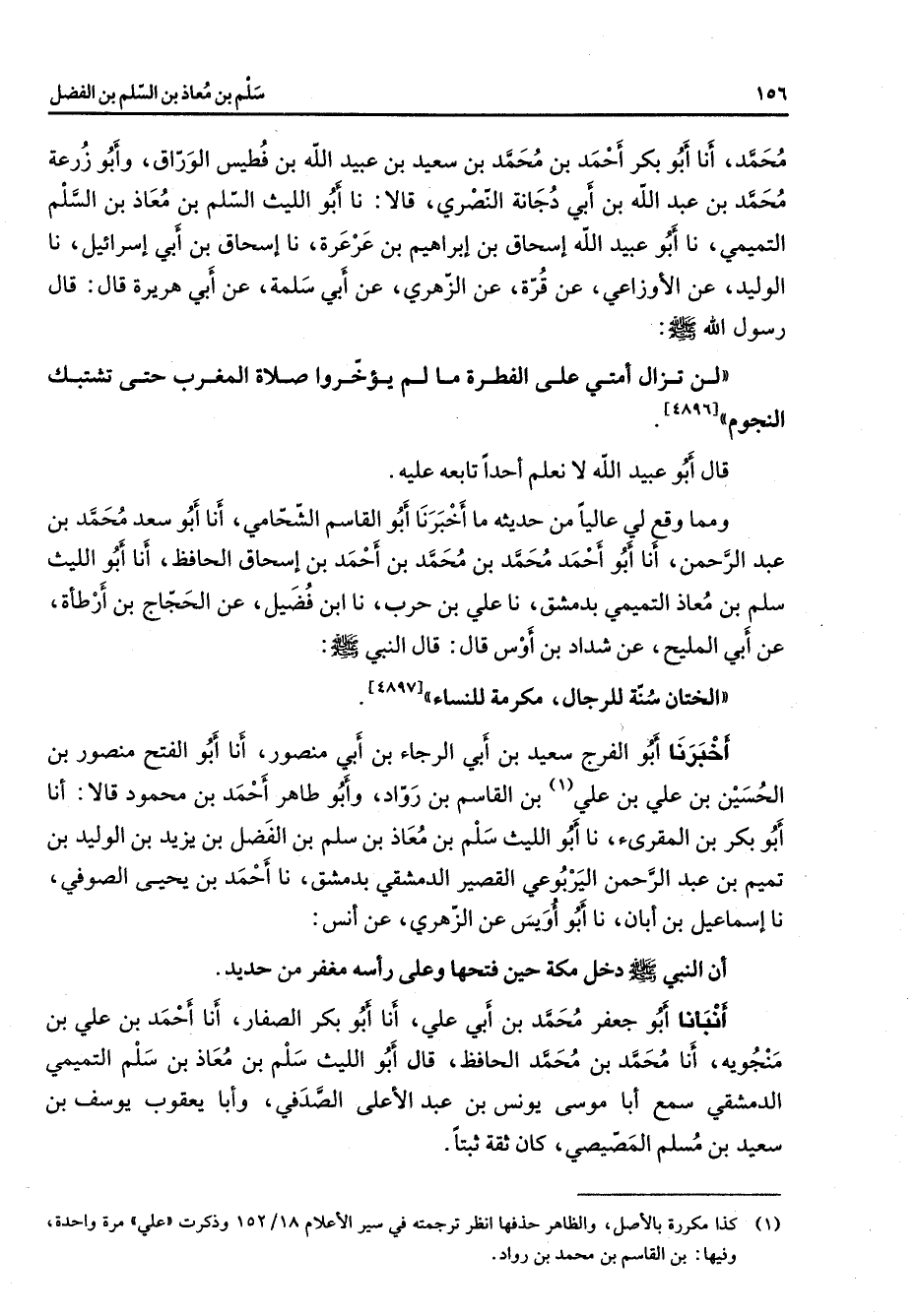 محمد أنا أبو بكر أحمد بن محمد بن سعيد بن عبيد الله بن فطيس الوراق وأبو زرعة محمد بن عبد الله بن أبي دجانة النصري قالا نا أبو الليث السلم بن معاذ بن السلم التميمي نا أبو عبيد الله إسحاق بن إبراهيم بن عرعرة نا إسحاق بن أبي إسرائيل نا الوليد عن الأوزاعي عن قرة عن الزهري عن أبي سلمة عن أبي هريرة قال قال رسول الله (صلى الله عليه وسلم) لن تزال أمتي على الفطرة ما لم يؤخروا صلاة المغرب حتى تشتبك النجوم قال أبو عبيد الله لا نعلم أحدا تابعه عليه ومما وقع لي عاليا من حديثه ما أخبرنا أبو القاسم الشحامي أنا أبو سعد محمد بن عبد الرحمن أنا أبو أحمد محمد بن محمد بن أحمد بن إسحاق الحافظ أنا أبو الليث سلم بن معاذ التميمي بدمشق نا علي بن حرب نا ابن فضيل عن الحجاج بن أرطأة عن أبي المليح عن شداد بن أوس قال قال النبي (صلى الله عليه وسلم) الختان سنة للرجال مكرمة للنساء أخبرنا أبو الفرج سعيد بن أبي الرجاء بن أبي منصور أنا أبو الفتح منصور بن الحسين بن علي بن علي (1) بن القاسم بن رواد وأبو طاهر أحمد بن محمود قالا أنا أبو بكر بن المقرئ نا أبو الليث سلم بن معاذ بن الفضل بن يزيد بن الوليد بن تميم بن عبد الرحمن اليربوعي القصير الدمشقي بدمشق نا أحمد بن يحيى الصوفي نا إسماعيل بن أبان نا أبو أويس عن الزهري عن أنس أن النبي (صلى الله عليه وسلم) دخل مكة حين فتحها وعلى رأسه مغفر من حديد أنبأنا أبو جعفر محمد بن أبي علي أنا أبو بكر الصفار أنا أحمد بن علي بن منجويه أنا محمد بن محمد الحافظ قال أبو الليث سلم بن معاذ بن سلم التميمي الدمشقي سمع أبا موسى يونس بن عبد الأعلى الصدفي وأبا يعقوب يوسف بن سعيد بن مسلم المصيصي كان ثقة ثبتا