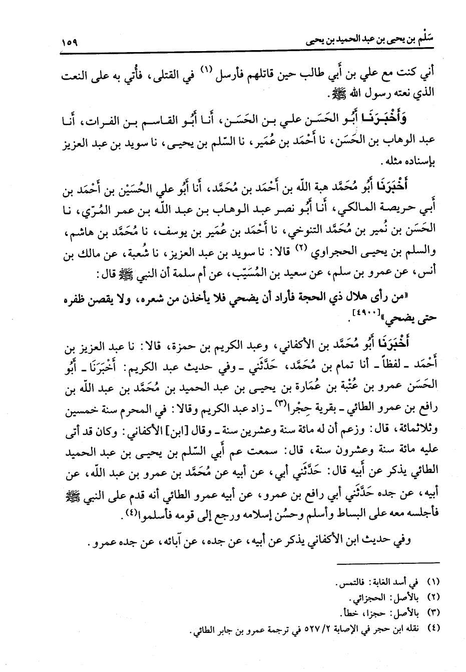 أني كنت مع علي بن أبي طالب حين قاتلهم فأرسل (1) في القتلى فأتي به على النعت الذي نعته رسول الله (صلى الله عليه وسلم) وأخبرنا أبو الحسن علي بن الحسن أنا أبو القاسم بن الفرات أنا عبد الوهاب بن الحسن نا أحمد بن عمير نا السلم بن يحيى نا سويد بن عبد العزيز بإسناده مثله أخبرنا أبو محمد هبة الله بن أحمد بن محمد أنا أبو علي الحسين بن أحمد بن أبي حريصة المالكي أنا أبو نصر عبد الوهاب بن عبد الله بن عمر المري نا الحسن بن نمير بن محمد التنوخي نا أحمد بن عمير بن يوسف نا محمد بن هاشم والسلم بن يحيى الحجراوي (2) قالا نا سويد بن عبد العزيز نا شعبة عن مالك بن أنس عن عمرو بن سلم عن سعيد بن المسيب عن أم سلمة أن النبي (صلى الله عليه وسلم) قال من رأى هلال ذي الحجة فأراد أن يضحي فلا يأخذن من شعره ولا يقصن ظفره حتى يضحي أخبرنا أبو محمد الأكفاني وعبد الكريم بن حمزة قالا نا عبد العزيز بن أحمد لفظا أنا تمام بن أحمد محمد حدثني وفي حديث عبد الكريم أخبرنا أبو الحسن عمرو بن عتبة بن عمارة بن يحيى بن عبد الحميد بن محمد بن عبد الله بن رافع بن عمرو الطائي بقرية حجرا (3) زاد عبد الكريم وقالا في المحرم سنة خمسين وثلاثمائة قال وزعم أن له مائة سنة وعشرين سنة وقال ابن الأكفاني وكان قد أتى عليه مائة سنة وعشرون سنة قال سمعت عم أبي السلم بن يحيى بن عبد الحميد الطائي يذكر عن أبيه قال حدثني أبي عن أبيه عن محمد بن عمرو بن عبد الله عن أبيه عن جده حدثني أبي رافع بن عمرو عن أبيه عمرو الطائي أنه قدم على النبي (صلى الله عليه وسلم) فأجلسه معه على البساط وأسلم وحسن إسلامه ورجع إلى قومه فأسلموا (4)