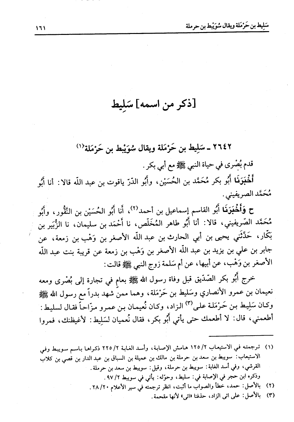 2642 - سليط بن حرملة ويقال سويبط بن حرملة (1) قدم بصرى في حياة النبي (صلى الله عليه وسلم) مع أبي بكر أخبرنا أبو بكر محمد بن الحسين وأبو الدر ياقوت بن عبد الله قالا أنا أبو محمد الصريفيني ح وأخبرنا أبو القاسم إسماعيل بن أحمد (2) أنا أبو الحسين بن النقور وأبو محمد الصريفيني قالا أنا أبو طاهر المخلص نا أحمد بن سليمان نا الزبير بن بكار حدثني يحيى بن أبي الحارث بن عبد الله الأصغر بن وهب بن زمعة عن جابر بن علي بن يزيد بن عبد الله الأصغر بن وهب بن زمعة عن قريبة بنت عبد الله الأصغر بن وهب عن أبيها عن أم سلمة زوج النبي (صلى الله عليه وسلم) قالت خرج أبو بكر الصديق قبل وفاة رسول الله (صلى الله عليه وسلم) بعام في تجارة إلى بصرى ومعه نعيمان بن عمرو الأنصاري وسليط بن حرملة وهما ممن شهد بدرا مع رسول الله (صلى الله عليه وسلم) وكان سليط بن حرملة على (3) الزاد وكان نعيمان بن عمرو مزاحا فقال لسليط أطعمني قال لا أطعمك حتى يأتي أبو بكر فقال نعيمان لسليط لأغيظنك فمروا