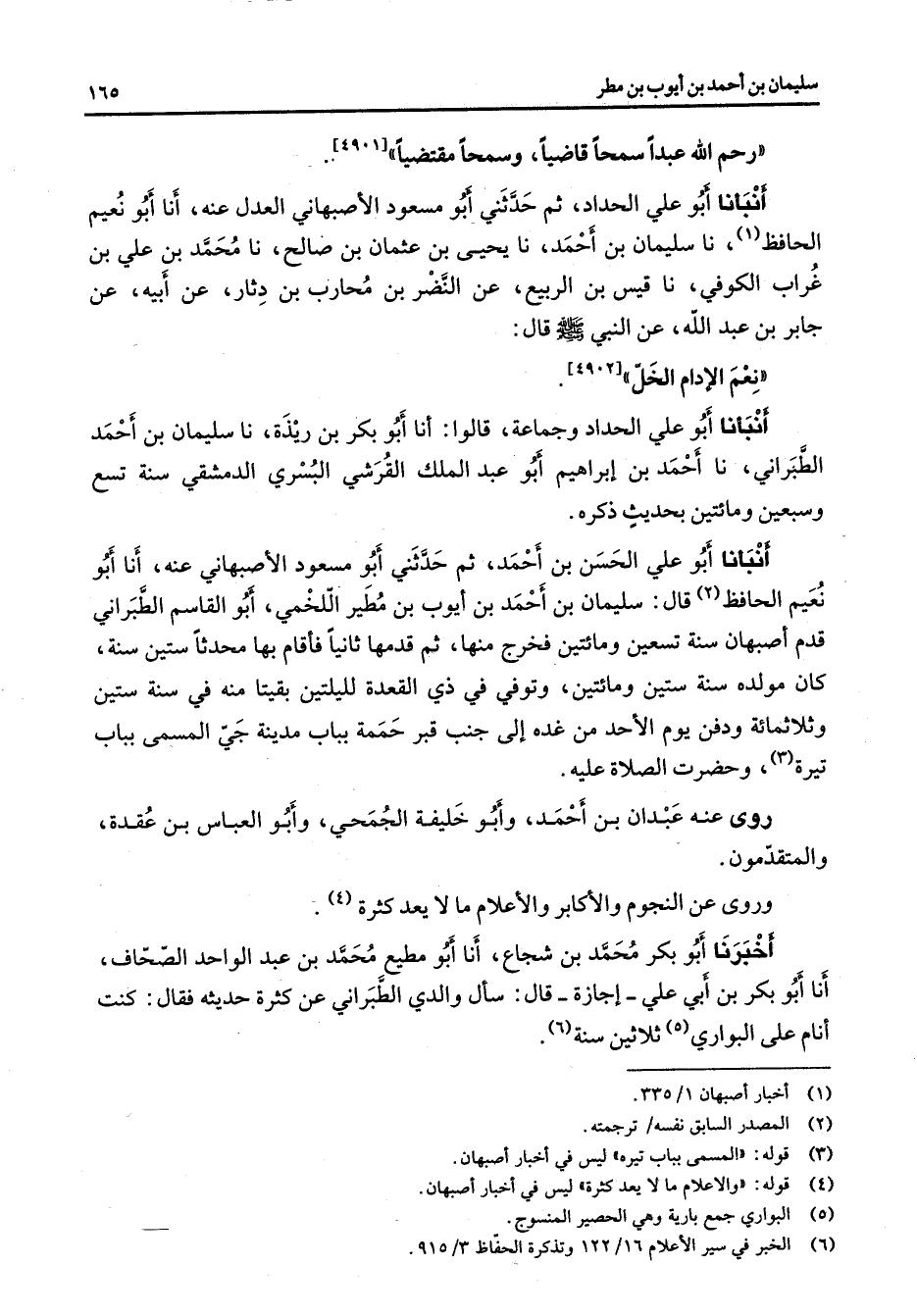 رحم الله عبدا سمحا قاضيا وسمحا مقتضيا أنبأنا أبو علي الحداد ثم حدثني أبو مسعود الأصبهاني العدل عنه أنا أبو نعيم الحافظ (1) نا سليمان بن أحمد نا يحيى بن عثمان بن صالح نا محمد بن علي بن غراب الكوفي نا قيس بن الربيع عن النضر بن محارب بن دثار عن أبيه عن جابر بن عبد الله عن النبي (صلى الله عليه وسلم) قال نعم الإدام الخل أنبأنا أبو علي الحداد وجماعة قالوا أنا أبو بكر بن ريذة نا سليمان بن أحمد الطبراني نا أحمد بن إبراهيم أبو عبد الملك القرشي البسري الدمشقي سنة تسع وسبعين ومائتين بحديث ذكره أنبأنا أبو علي الحسن بن أحمد ثم حدثني أبو مسعود الأصبهاني عنه أنا أبو نعيم الحافظ (2) قال سليمان بن أحمد بن أيوب بن مطير اللخمي أبو القاسم الطبراني قدم أصبهان سنة تسعين ومائتين فخرج منها ثم قدمها ثانيا فأقام بها محدثا ستين سنة كان مولده سنة ستين ومائتين وتوفي في ذي القعدة لليلتين بقيتا منه في سنة ستين وثلاثمائة ودفن يوم الأحد من غده إلى جنب قبر حممة بباب مدينة جي المسمى بباب تيرة (3) وحضرت الصلاة عليه روى عنه عبدان بن أحمد وأبو خليفة الجمحي وأبو العباس بن عقدة والمتقدمون وروى عن النجوم والأكابر والأعلام ما لا يعد كثرة (4)