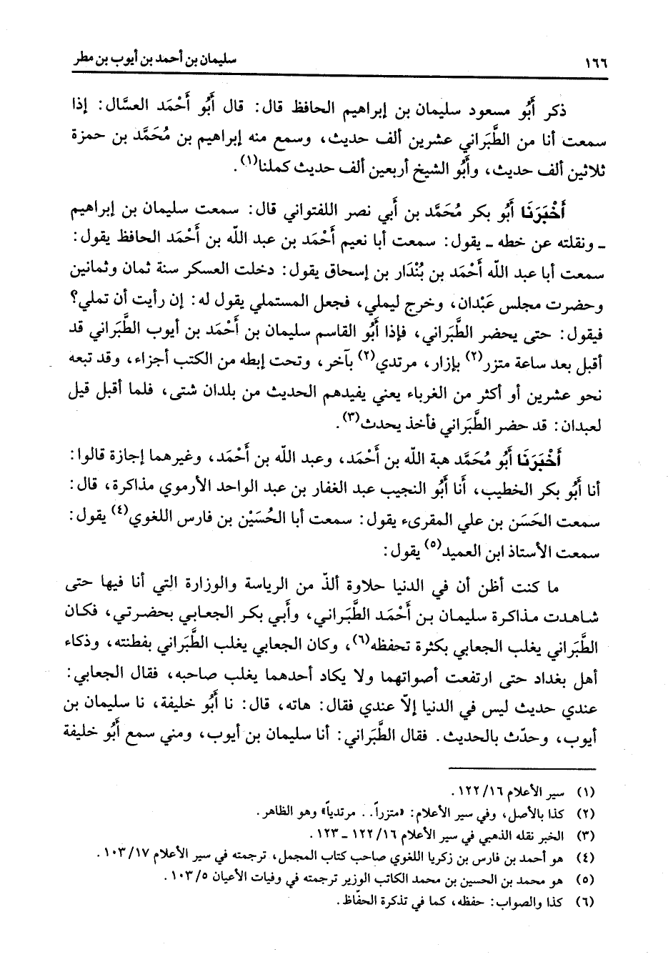 أخبرنا أبو محمد هبة الله بن أحمد وعبد الله بن أحمد وغيرهما إجازة قالوا أنا أبو بكر الخطيب أنا أبو النجيب عبد الغفار بن عبد الواحد الأرموي مذاكرة قال سمعت الحسن بن علي المقرئ يقول سمعت أبا الحسين بن فارس اللغوي (4) يقول سمعت الأستاذ ابن العميد (5) يقول: ما كنت أظن أن في الدنيا حلاوة ألذ من الرياسة والوزارة التي أنا فيها حتى شاهدت مذاكرة سليمان بن أحمد الطبراني وأبي بكر الجعابي بحضرتي فكان الطبراني يغلب الجعابي بكثرة تحفظه (6) وكان الجعابي يغلب الطبراني بفطنته وذكاء أهل بغداد حتى ارتفعت أصواتهما ولا يكاد أحدهما يغلب صاحبه فقال الجعابي عندي حديث ليس في الدنيا إلا عندي فقال هاته قال نا أبو خليفة نا سليمان بن أيوب وحدث بالحديث فقال الطبراني أنا سليمان بن أيوب ومني سمع أبو خليفة