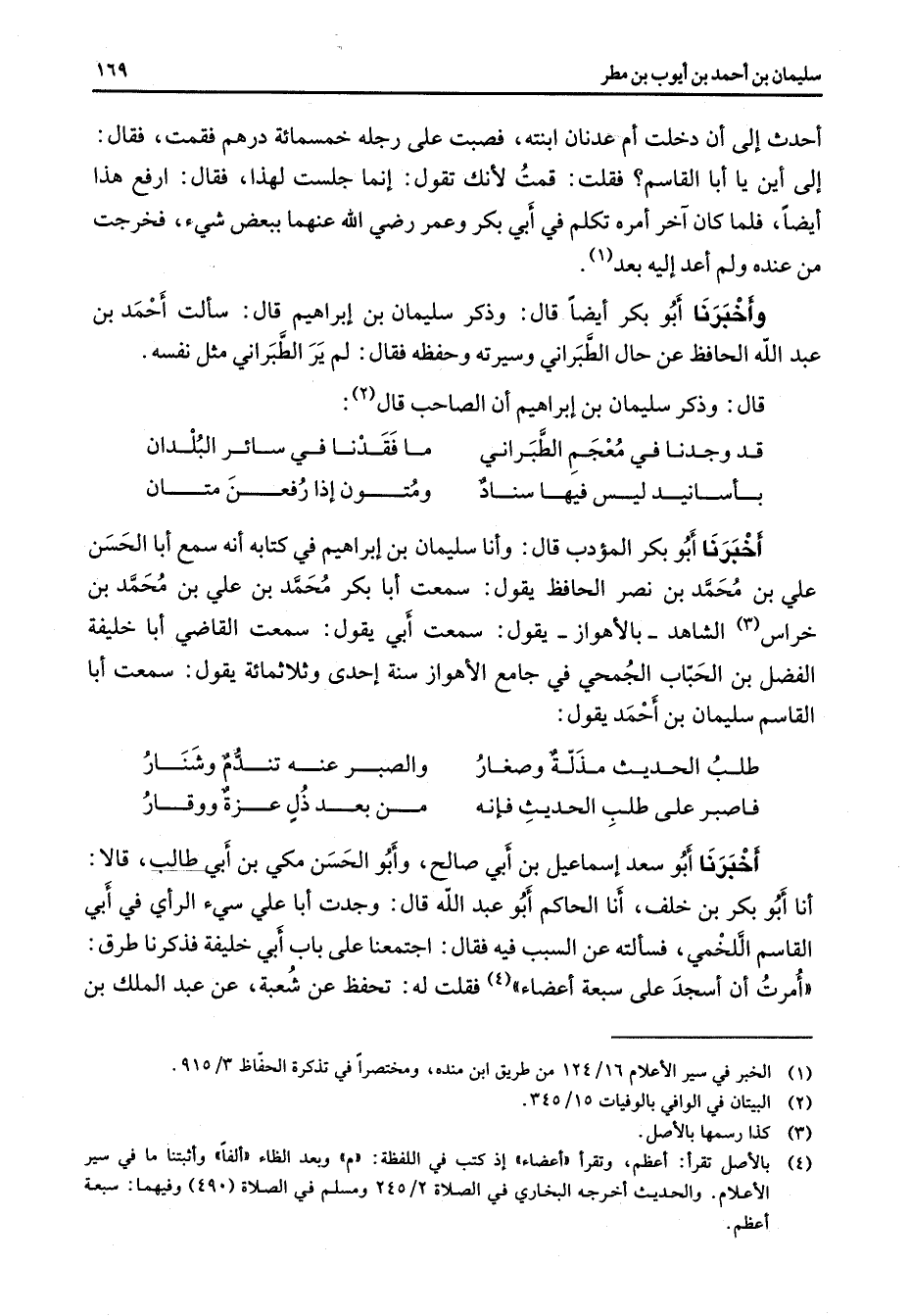 وأخبرنا أبو بكر أيضا قال وذكر سليمان بن إبراهيم قال سألت أحمد بن عبد الله الحافظ عن حال الطبراني وسيرته وحفظه فقال لم ير الطبراني مثل نفسه قال وذكر سليمان بن إبراهيم أن الصاحب قال (2) : * قد وجدنا في معجم الطبراني * ما فقدنا في سائر البلدان بأسانيد ليس فيها سناد * ومتون إذا رفعن متان * أخبرنا أبو بكر المؤدب قال وأنا سليمان بن إبراهيم في كتابه أنه سمع أبا الحسن علي بن محمد بن نصر الحافظ يقول سمعت أبا بكر محمد بن علي بن محمد بن خراس (3) الشاهد بالأهواز يقول سمعت أبي يقول سمعت القاضي أبا خليفة الفضل بن الحباب الجمحي في جامع الأهواز سنة إحدى وثلاثمائة يقول سمعت أبا القاسم سليمان بن أحمد يقول * طلب الحديث مذلة وصغار * والصبر عنه تندم وشنار فاصبر على طلب الحديث فإنه * من بعد ذل عزة ووقار * أخبرنا أبو سعد إسماعيل بن أبي صالح وأبو الحسن مكي بن أبي طالب قالا أنا أبو بكر بن خلف أنا الحاكم أبو عبد الله قال وجدت أبا علي سئ الرأي في أبي القاسم اللخمي فسألته عن السبب فيه فقال اجتمعنا على باب أبي خليفة فذكرنا طرق أمرت أن أسجد على سبعة أعضاء (4) فقلت له تحفظ عن شعبة عن عبد الملك بن