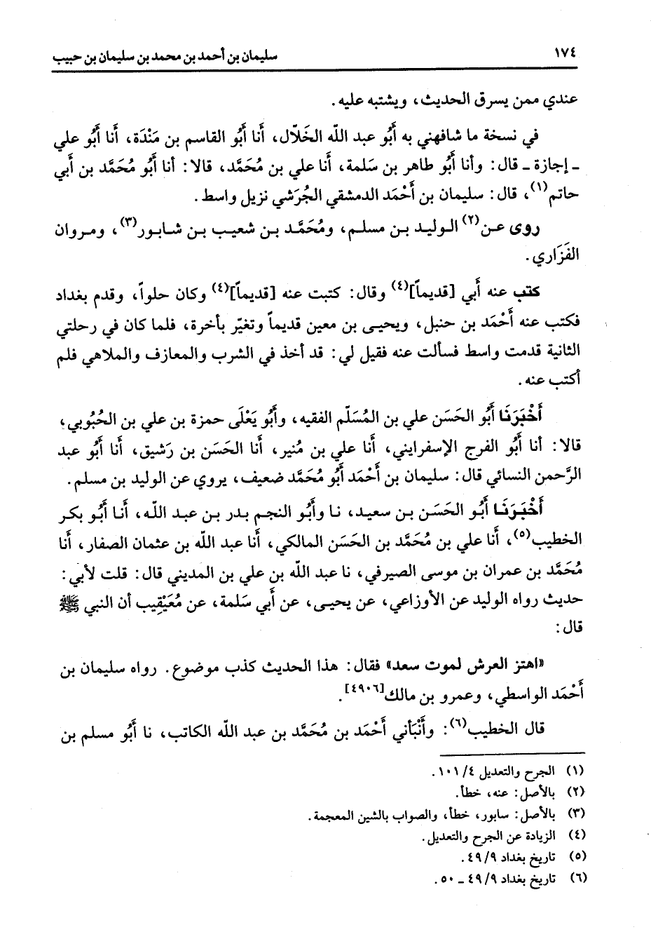 عندي ممن يسرق الحديث ويشتبه عليه في نسخة ما شافهني به أبو عبد الله الخلال أنا أبو القاسم بن مندة أنا أبو علي إجازة قال وأنا أبو طاهر بن سلمة أنا علي بن محمد قالا أنا أبو محمد بن أبي حاتم (1) قال سليمان بن أحمد الدمشقي الجرشي نزيل واسط روى عن (2) الوليد بن مسلم ومحمد بن شعيب بن شابور (3) ومروان الفزاري كتب عنه أبي قديما (4) وقال كتبت عنه قديما (4) وكان حلوا وقدم بغداد فكتب عنه أحمد بن حنبل ويحيى بن معين قديما وتغير بأخرة فلما كان في رحلتي الثانية قدمت واسط فسألت عنه فقيل لي قد أخذ في الشرب والمعازف والملاهي فلم أكتب عنه أخبرنا أبو الحسن علي بن المسلم الفقيه وأبو يعلى حمزة بن علي بن الحبوبي قالا أنا أبو الفرج الإسفرايني أنا علي بن منير أنا الحسن بن رشيق أنا أبو عبد الرحمن النسائي قال سليمان بن أحمد أبو محمد ضعيف يروي عن الوليد بن مسلم أخبرنا أبو الحسن بن سعيد نا وأبو النجم بدر بن عبد الله أنا أبو بكر الخطيب (5) أنا علي بن محمد بن الحسن المالكي أنا عبد الله بن عثمان الصفار أنا محمد بن عمران بن موسى الصيرفي نا عبد الله بن علي بن المديني قال قلت لأبي حديث رواه الوليد عن الأوزاعي عن يحيى عن أبي سلمة عن معيقيب أن النبي (صلى الله عليه وسلم) قال: اهتز العرش لموت سعد فقال هذا الحديث كذب موضوع رواه سليمان بن أحمد الواسطي وعمرو بن مالك قال الخطيب (6) وأنبأني أحمد بن محمد بن عبد الله الكاتب نا أبو مسلم بن