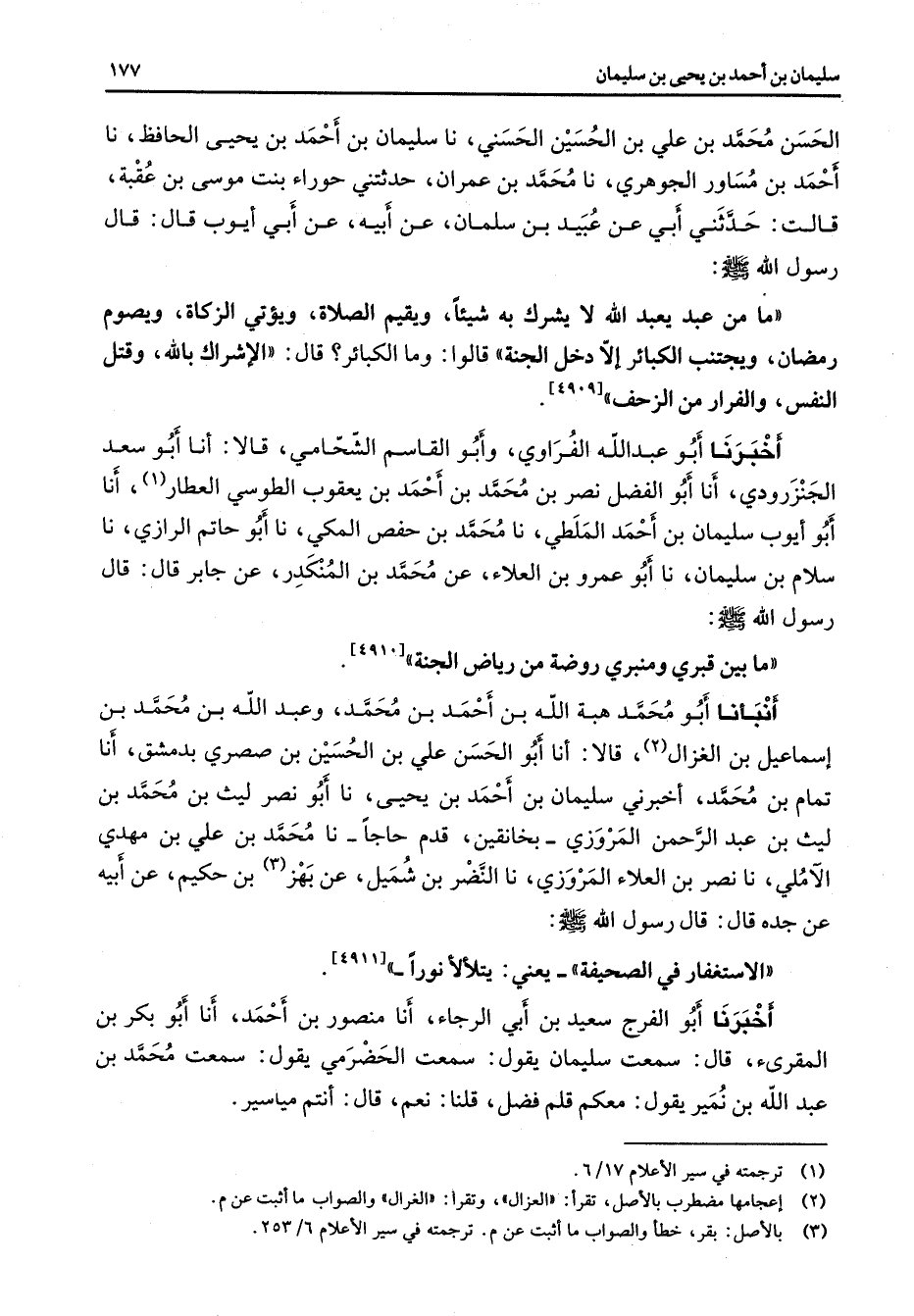 الحسن محمد بن علي بن الحسين الحسني نا سليمان بن أحمد بن يحيى الحافظ نا أحمد بن مساور الجوهري نا محمد بن عمران حدثتني حوراء بنت موسى بن عقبة قالت حدثني أبي عن عبيد بن سلمان عن أبيه عن أبي أيوب قال قال رسول الله (صلى الله عليه وسلم) ما من عبد يعبد الله لا يشرك به شيئا ويقيم الصلاة ويؤتي الزكاة ويصوم رمضان ويجتنب الكبائر إلا دخل الجنة قالوا وما الكبائر قال الإشراك بالله وقتل النفس والفرار من الزحف أخبرنا أبو عبد الله الفراوي وأبو القاسم الشحامي قالا أنا أبو سعد الجنزرودي أنا أبو الفضل نصر بن محمد بن أحمد بن يعقوب الطوسي العطار (1) أنا أبو أيوب سليمان بن أحمد الملطي نا محمد بن حفص المكي نا أبو حاتم الرازي نا سلام بن سليمان نا أبو عمرو بن العلاء عن محمد بن المنكدر عن جابر قال قال رسول الله (صلى الله عليه وسلم) ما بين قبري ومنبري روضة من رياض الجنة أنبأنا أبو محمد هبة الله بن أحمد بن محمد وعبد الله بن محمد بن إسماعيل بن الغزال (2) قالا أنا أبو الحسن علي بن الحسين بن صصري بدمشق أنا تمام بن محمد أخبرني سليمان بن أحمد بن يحيى نا أبو نصر ليث بن محمد بن ليث بن عبد الرحمن المروزي بخانقين قدم حاجا نا محمد بن علي بن مهدي الآملي نا نصر بن العلاء المروزي نا النضر بن شميل عن بهز (3) بن حكيم عن أبيه عن جده قال قال رسول الله (صلى الله عليه وسلم) الاستغفار في الصحيفة يعني يتلألأ نورا أخبرنا أبو الفرج سعيد بن أبي الرجاء أنا منصور بن أحمد أنا أبو بكر بن المقرئ قال سمعت سليمان يقول سمعت الحضرمي يقول سمعت محمد بن عبد الله بن نمير يقول معكم قلم فضل قلنا نعم قال أنتم مياسير