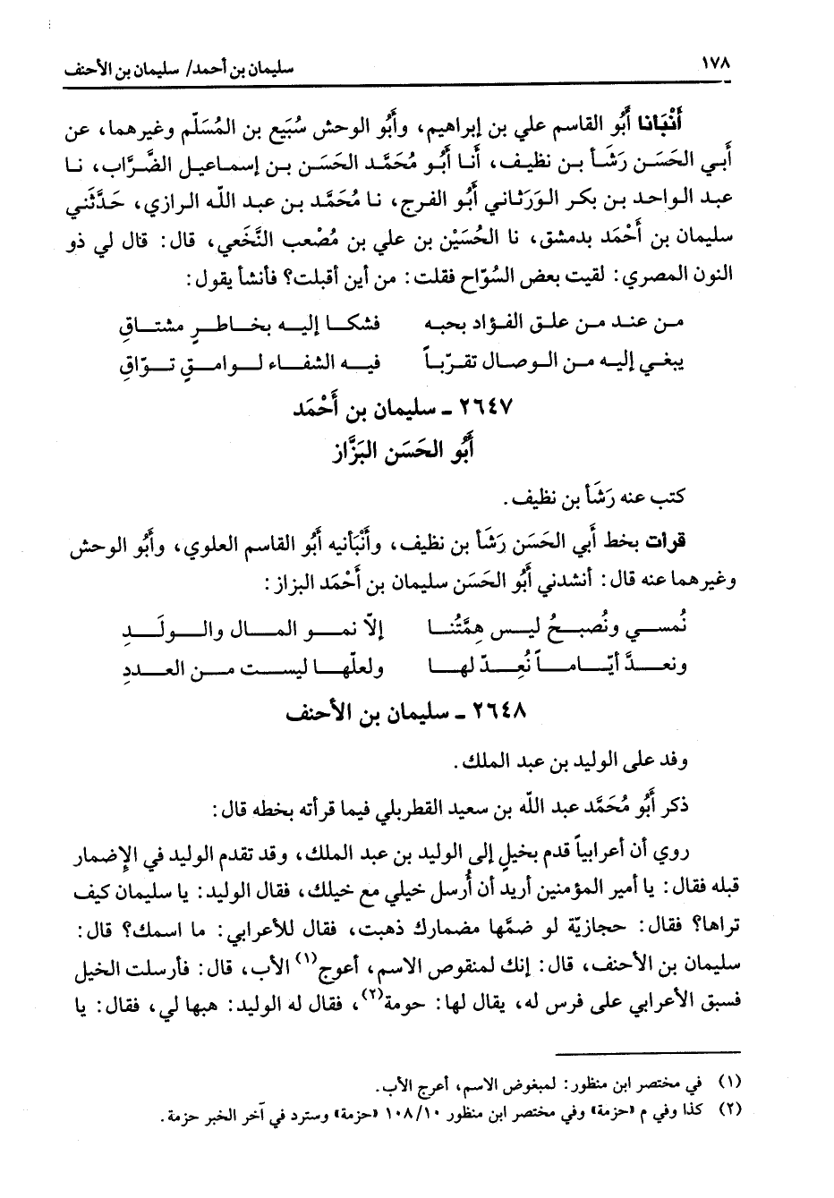 أنبأنا أبو القاسم علي بن إبراهيم وأبو الوحش سبيع بن المسلم وغيرهما عن أبي الحسن رشأبن نظيف أنا أبو محمد الحسن بن إسماعيل الضراب نا عبد الواحد بن بكر الورثاني أبو الفرج نا محمد بن عبد الله الرازي حدثني سليمان بن أحمد بدمشق نا الحسين بن علي بن مصعب النخعي قال قال لي ذو النون المصري لقيت بعض السواح فقلت من أين أقبلت فأنشأ يقول * من عند من علق الفؤاد بحبه * فشكا إليه بخاطر مشتاق يبغي إليه من الوصال تقربا * فيه الشفاء لوامق تواق * 2647 سليمان بن أحمد أبو الحسن البزاز كتب عنه رشأ بن نظيف قرأت بخط أبي الحسن رشأ بن نظيف وأنبأنيه أبو القاسم العلوي وأبو الوحش وغيرهما عنه قال أنشدني أبو الحسن سليمان بن أحمد البزاز * نمسي ونصبح ليس همتنا * إلا نمو المال والولد ونعد أياما نعد لها * ولعلها ليست من العدد * " 2648 سليمان بن الأحنف " وفد على الوليد بن عبد الملك ذكر أبو محمد عبد الله بن سعيد القطربلي فيما قرأته بخطه قال روي أن أعرابيا قدم بخيل إلى الوليد بن عبد الملك وقد تقدم الوليد في الإضمار قبله فقال يا أمير المؤمنين أريد أن أرسل خيلي مع خيلك فقال الوليد يا سليمان كيف تراها فقال حجازية لو ضمها مضمارك ذهبت فقال للأعرابي ما اسمك قال سليمان بن الأحنف قال إنك لمنقوص الاسم أعوج الأب قال فأرسلت الخيل فسبق الأعرابي على فرس له يقال لها حومة فقال له الوليد هبها لي فقال يا