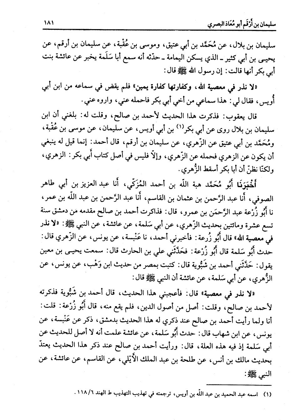 سليمان بن بلال عن محمد بن أبي عتيق وموسى بن عقبة عن سليمان بن أرقم عن يحيى بن أبي كثير الذي يسكن اليمامة حدثه أنه سمع أبا سلمة يخبر عن عائشة بنت أبي بكر أنها قالت إن رسول الله (صلى الله عليه وسلم) قال لا نذر في معصية الله وكفارتها كفارة يمين فلم يقض في سماعه من ابن أبي أويس فقال لي هذا سماعي من أخي أبي بكر فاحمله عني واروه عني قال يعقوب فذكرت هذا الحديث لأحمد بن صالح وقلت له بلغني أن ابن سليمان بن بلال روى عن أبي بكر (1) بن أبي أويس عن سليمان عن موسى بن عقبة ومحمد بن أبي عتيق عن الزهري عن سليمان بن أرقم قال أحمد إنما قيل له ينبغي أن يكون عن الزهري فحمله عن الزهري وإلا فليس في أصل كتاب أبي بكر الزهري ولكنا نظن أن أبا بكر أسقط الزهري أخبرنا أبو محمد هبة الله بن أحمد المزكي أنا عبد العزيز بن أبي طاهر الصوفي أنا عبد الرحمن بن عثمان بن القاسم أنا عبد الرحمن بن عبد الله بن عمر نا أبو زرعة عبد الرحمن بن عمرو قال فذاكرت أحمد بن صالح مقدمه من دمشق سنة تسع عشرة ومائتين بحديث الزهري عن أبي سلمة عن عائشة عن النبي (صلى الله عليه وسلم) لا نذر في معصية الله قال أبو زرعة فأخبرني أحمد نا عنبسة عن يونس عن الزهري قال حدث أبو سلمة قال أبو زرعة فحدثني علي بن الحارث قال سمعت يحيى بن معين يقول حدثني أحمد بن شبوية قال كتبت بمصر من حديث ابن وهب عن يونس عن الزهري عن أبي سلمة عن عائشة أن النبي (صلى الله عليه وسلم) قال لا نذر في معصية قال فأعجبني هذا الحديث قال أحمد بن شبوية فذكرته لأحمد بن صالح وقلت أصل من أصول الدين فلم يقع منه قال أبو زرعة قلت أنا ولما رأيت أحمد بن صالح عند ذكري له هذا الحديث بدمشق ذكر عن عنبسة عن يونس عن ابن شهاب قال حدث أبو سلمة عن عائشة علمت أنه لا أصل للحديث عن أبي سلمة إذ فيه هذه العلة قال ورأيت أحمد بن صالح عند ذكر هذا الحديث يعتد بحديث مالك بن أنس عن طلحة بن عبد الملك الأيلي عن القاسم عن عائشة عن النبي ص