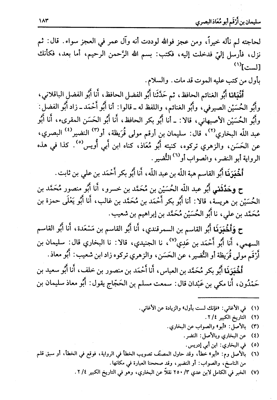 لحاجته لم نأله خيرا ومن عجز فو الله لوددت أنه وآل عمر في العجز سواء قال ثم نزل فأرسل إلي فدخلت إليه فكتب بسم الله الرحمن الرحيم أما بعد فكأنك لست (1) بأول من كتب عليه الموت قد مات والسلام أنبأنا أبو الغنائم الحافظ ثم حدثنا أبو الفضل الحافظ أنا أبو الفضل الباقلاني وأبو الحسين الصيرفي وأبو الغنائم واللفظ له قالوا أنا أبو أحمد زاد أبو الفضل وأبو الحسين الأصبهاني قالا أنا أبو بكر الحافظ أنا أبو الحسن المقرئ أنا أبو عبد الله البخاري (2) قال سليمان بن أرقم مولى قريظة أو (3) النضير (4) البصري عن الحسن والزهري تركوه كنيته أبو معاذ كناه ابن أبي أويس (5) كذا في هذه الرواية أبو النضر والصواب أو (6) النضير أخبرنا أبو القاسم هبة الله بن عبد الله أنا أبو بكر أحمد بن علي بن ثابت ح وحدثني أبو عبد الله الحسين بن محمد بن خسرو أنا أبو منصور محمد بن الحسين بن هريسة قالا أنا أبو بكر أحمد بن محمد بن غالب أنا أبو يعلى حمزة بن محمد بن علي نا أبو الحسين محمد بن إبراهيم بن شعيب ح وأخبرنا أبو القاسم بن السمرقندي أنا أبو القاسم بن مسعدة أنا أبو القاسم السهمي أنا أبو أحمد بن عدي (7) نا الجنيدي قالا نا البخاري قال سليمان بن أرقم مولى قريظة أو النضير عن الحسن والزهري تركوه زاد ابن شعيب أبو معاذ أخبرنا أبو بكر محمد بن العباس أنا أحمد بن منصور بن خلف أنا أبو سعيد بن حمدون أنا مكي بن عبدان قال سمعت مسلم بن الحجاج يقول أبو معاذ سليمان بن