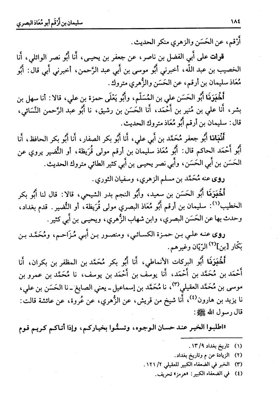 أرقم عن الحسن والزهري منكر الحديث قرأت على أبي الفضل بن ناصر عن جعفر بن يحيى أنا أبو نصر الوائلي أنا الخصيب بن عبد الله أخبرني أبو موسى بن أبي عبد الرحمن أخبرني أبي قال أبو معاذ سليمان بن أرقم عن الحسن والزهري متروك أخبرنا أبو الحسن علي بن المسلم وأبو يعلى حمزة بن علي قالا أنا سهل بن بشر أنا علي بن منير بن أحمد أنا الحسن بن رشيق نا أبو عبد الرحمن النسائي قال سليمان بن أرقم أبو معاذ متروك الحديث أنبأنا أبو جعفر محمد بن أبي علي أنا أبو بكر الصفار أنا أبو بكر الحافظ أنا أبو أحمد الحاكم قال أبو معاذ سليمان بن أرقم مولى قريظة أو النضير يروي عن الحسن بن أبي الحسن وأبي نصر يحيى بن أبي كثير الطائي متروك الحديث روى عنه محمد بن مسلم الزهري وسفيان الثوري أخبرنا أبو الحسن بن سعيد وأبو النجم بدر الشيحي قالا قال لنا أبو بكر الخطيب (1) : سليمان بن أرقم أبو معاذ البصري مولى قريظة أوالنضير قدم بغداد وحدث بها عن الحسن البصري وابن شهاب الزهري ويحيى بن أبي كثير روى عنه علي بن حمزة الكسائي ومنصور بن أبي مزاحم ومحمد بن بكار بن (2) الريان وغيرهم أخبرنا أبو البركات الأنماطي أنا أبو بكر محمد بن المظفر بن بكران أنا أحمد بن محمد بن أحمد أنا يوسف بن أحمد بن يوسف نا محمد بن عمرو بن موسى بن محمد العقيلي (3) نا محمد بن إسماعيل يعني الصايغ نا الحسن بن علي نا يزيد بن هارون (4) أنا شيخ من قريش عن الزهري عن عروة عن عائشة قالت قال رسول الله (صلى الله عليه وسلم) اطلبوا الخير عند حسان الوجوه وتسموا بخياركم وإذا أتاكم كريم قوم