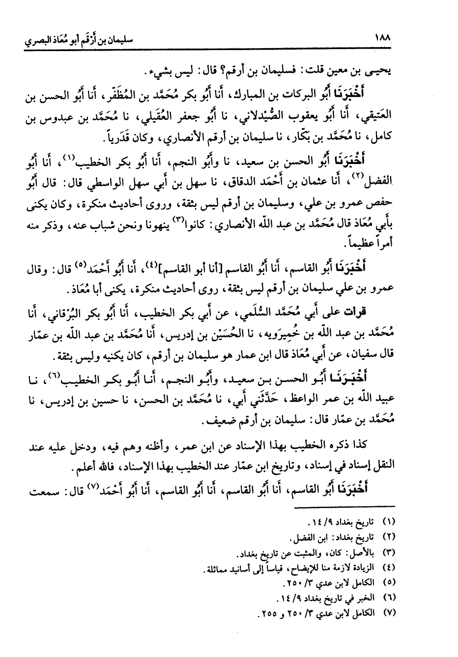 يحيى بن معين قلت فسليمان بن أرقم قال ليس بشئ أخبرنا أبو البركات بن المبارك أنا أبو بكر محمد بن المظفر أنا أبو الحسن بن العتيقي أنا أبو يعقوب الصيدلاني نا أبو جعفر العقيلي نا محمد بن عبدوس بن كامل نا محمد بن بكار نا سليمان بن أرقم الأنصاري وكان قدريا أخبرنا أبو الحسن بن سعيد نا وأبو النجم أنا أبو بكر الخطيب (1) أنا أبو الفضل (2) أنا عثمان بن أحمد الدقاق نا سهل بن أبي سهل الواسطي قال قال أبو حفص عمرو بن علي وسليمان بن أرقم ليس بثقة وروى أحاديث منكرة وكان يكنى بأبي معاذ قال محمد بن عبد الله الأنصاري كانوا (3) ينهونا ونحن شباب عنه وذكر منه أمرا عظيما أخبرنا أبو القاسم أنا أبو القاسم أنا أبو القاسم (4) أنا أبو أحمد (5) قال وقال عمرو بن علي سليمان بن أرقم ليس بثقة روى أحاديث منكرة يكنى أبا معاذ قرأت على أبي محمد السلمي عن أبي بكر الخطيب أنا أبو بكر البرقاني أنا محمد بن عبد الله بن خميرويه نا الحسين بن إدريس أنا محمد بن عبد الله بن عمار قال سفيان عن أبي معاذ قال ابن عمار هو سليمان بن أرقم كان يكنيه وليس بثقة أخبرنا أبو الحسن بن سعيد وأبو النجم أنا أبو بكر الخطيب (6) نا عبيد الله بن عمر الواعظ حدثني أبي نا محمد بن الحسن نا حسين بن إدريس نا محمد بن عمار قال سليمان بن أرقم ضعيف كذا ذكره الخطيب بهذا الإسناد عن ابن عمر وأظنه وهم فيه ودخل عليه عند النقل إسناد في إسناد وتاريخ ابن عمار عند الخطيب بهذا الإسناد فالله أعلم أخبرنا أبو القاسم أنا أبو القاسم أنا أبو القاسم أنا أبو أحمد (7) قال سمعت
