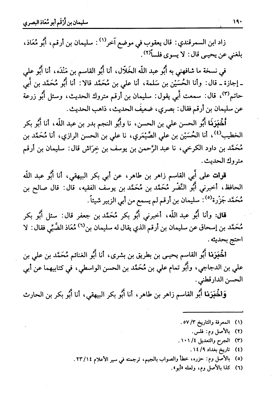 في نسخة ما شافهني به أبو عبد الله الخلال أنا أبو القاسم بن منده أنا أبو علي إجازة قال وأنا الحسين بن سلمة أنا علي بن محمد قالا أنا أبو محمد بن أبي حاتم (3) قال سمعت أبي يقول سليمان بن أرقم متروك الحديث وسئل أبو زرعة عن سليمان بن أرقم فقال بصري ضعيف الحديث ذاهب الحديث أخبرنا أبو الحسن علي بن الحسن نا وأبو النجم بدر بن عبد الله أنا أبو بكر الخطيب (4) أنا الحسين بن علي الصيمري نا علي بن الحسن الرازي أنا محمد بن محمد بن داود الكرخي نا عبد الرحمن بن يوسف بن خراش قال سليمان بن أرقم متروك الحديث قرأت على أبي القاسم زاهر بن طاهر عن أبي بكر البيهقي أنا أبو عبد الله الحافظ أخبرني أبو النضر محمد بن محمد بن يوسف الفقيه قال قال صالح بن محمد جزرة (5) : سليمان بن أرقم لم يسمع من أبي الزبير شيئا قال وأنا أبو عبد الله أخبرني أبو بكر محمد بن جعفر قال سئل أبو بكر محمد بن إسحاق عن سليمان بن أرقم الذي يقال له سليمان بن (6) معاذ الضبي فقال لا احتج بحديثه أخبرنا أبو القاسم يحيى بن بطريق بن بشرى أنا أبو الغنائم محمد بن علي بن علي بن الدجاجي وأبو تمام علي بن محمد بن الحسن الواسطي في كتابيهما عن أبي الحسن الدارقطني وأخبرنا أبو القاسم زاهر بن طاهر أنا أبو بكر البيهقي أنا أبو بكر بن الحارث