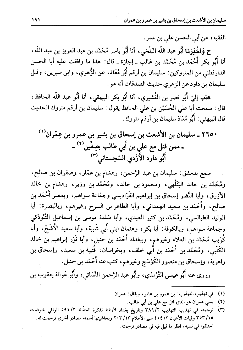 2650 - سليمان بن الأشعث بن إسحاق بن بشير بن عمرو بن عمران (1) ممن قتل مع علي بن أبي طالب بصفين (2) أبو داود الأزدي السجستاني (3) سمع بدمشق سليمان بن عبد الرحمن وهشام بن عمار وصفوان بن صالح ومحمد بن خالد البتلهي ومحمود بن خالد ومحمد بن وزير وهشام بن خالد الأزرق وأبا النضر إسحاق بن إبراهيم الفراديسي وجماعة سواهم وبمصر أحمد بن صالح وأحمد بن سعيد الهمداني وأبا الطاهر بن السرح وغيرهم وبالبصرة أبا الوليد الطيالسي ومحمد بن كثير العبدي وأبا سلمة موسى بن إسماعيل التبوذكي وجماعة سواهم وبالكوفة أبا بكر وعثمان ابني أبي شيبة وأبا سعيد الأشج وأبا كريب محمد بن العلاء وغيرهم وببغداد أحمد بن حنبل وأبا ثور إبراهيم بن خالد الكلبي ومحمد بن أحمد بن أبي خلف وبخراسان قتيبة بن سعيد وإسحاق بن راهوية وإسحاق بن منصور الكوسج وغيرهم كتب عنه أحمد بن حنبل وروى عنه أبو عيسى الترمذي وأبو عبد الرحمن النسائي وأبو عوانة يعقوب بن