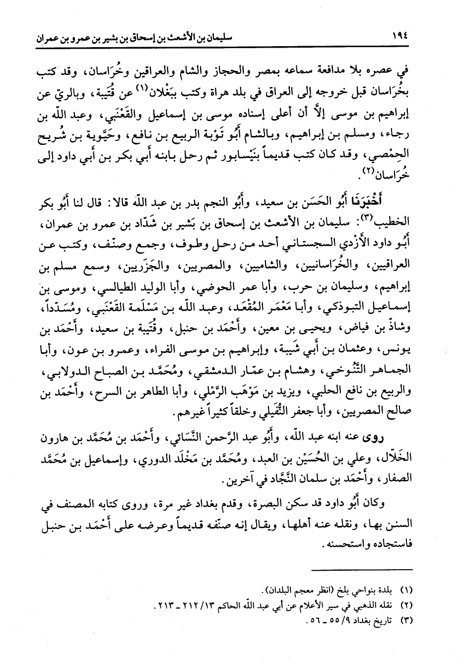 أخبرنا أبو الحسن بن سعيد وأبو النجم بدر بن عبد الله قالا قال لنا أبو بكر الخطيب (3) : سليمان بن الأشعث بن إسحاق بن بشير بن شداد بن عمرو بن عمران أبو داود الأزدي السجستاني أحد من رحل وطوف وجمع وصنف وكتب عن العراقيين والخراسانيين والشاميين والمصريين والجزريين وسمع مسلم بن إبراهيم وسليمان بن حرب وأبا عمر الحوضي وأبا الوليد الطيالسي وموسى بن إسماعيل التبوذكي وأبا معمر المقعد وعبد الله بن مسلمة القعنبي ومسددا وشاذ بن فياض ويحيى بن معين وأحمد بن حنبل وقتيبة بن سعيد وأحمد بن يونس وعثمان بن أبي شيبة وإبراهيم بن موسى الفراء وعمرو بن عون وأبا الجماهر التنوخي وهشام بن عمار الدمشقي ومحمد بن الصباح الدولابي والربيع بن نافع الحلبي ويزيد بن موهب الرملي وأبا الطاهر بن السرح وأحمد بن صالح المصريين وأبا جعفر النفيلي وخلقا كثيرا غيرهم روى عنه ابنه عبد الله وأبو عبد الرحمن النسائي وأحمد بن محمد بن هارون الخلال وعلي بن الحسين بن العبد ومحمد بن مخلد الدوري وإسماعيل بن محمد الصفار وأحمد بن سلمان النجاد في آخرين وكان أبو داود قد سكن البصرة وقدم بغداد غير مرة وروى كتابه المصنف في السنن بها ونقله عنه أهلها ويقال إنه صنفه قديما وعرضه على أحمد بن حنبل فاستجاده واستحسنه