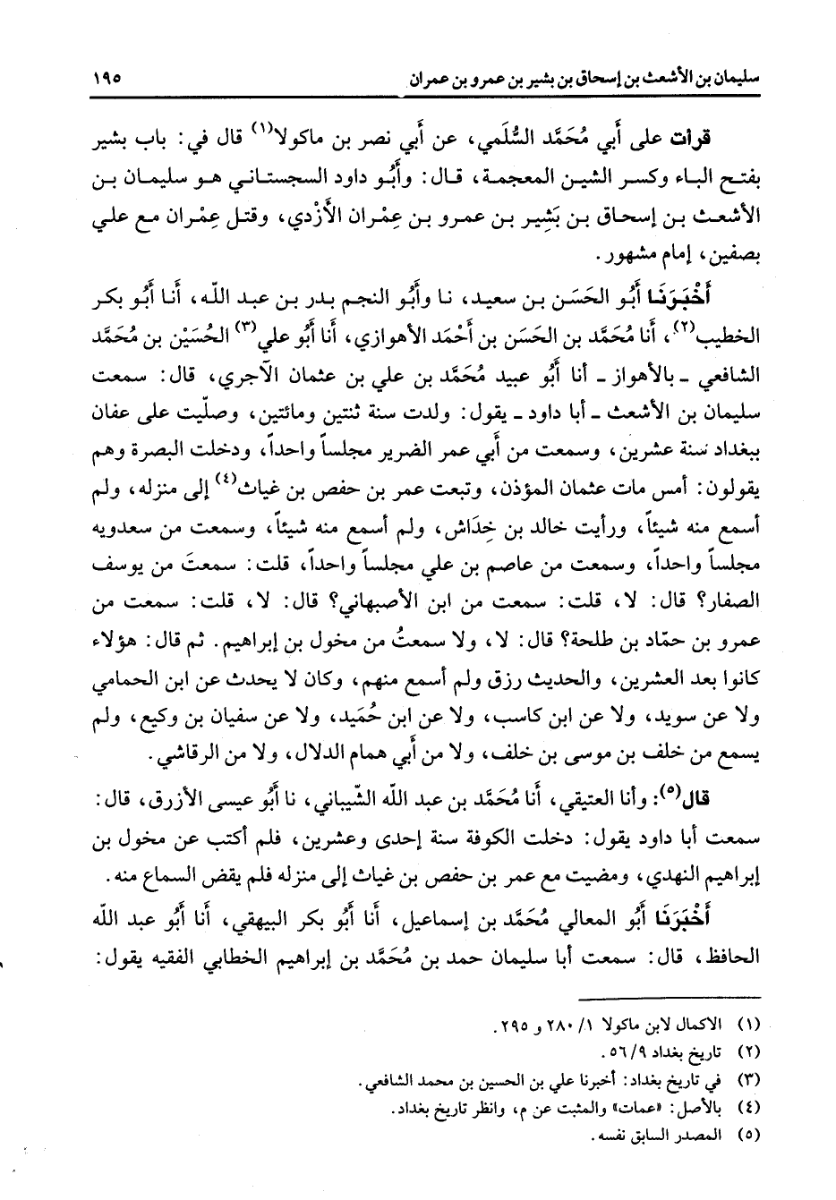 قرأت على أبي محمد السلمي عن أبي نصر بن ماكولا (1) قال في باب بشير بفتح الباء وكسر الشين المعجمة قال وأبو داود السجستاني هو سليمان بن الأشعث بن إسحاق بن بشير بن عمرو بن عمران الأزدي وقتل عمران مع علي بصفين إمام مشهور أخبرنا أبو الحسن بن سعيد نا وأبو النجم بدر بن عبد الله أنا أبو بكر الخطيب (2) أنا محمد بن الحسن بن أحمد الأهوازي أنا أبو علي (3) الحسين بن محمد الشافعي بالأهواز أنا أبو عبيد محمد بن علي بن عثمان الآجري قال سمعت سليمان بن الأشعث أبا داود يقول ولدت سنة ثنتين ومائتين وصليت على عفان ببغداد سنة عشرين وسمعت من أبي عمر الضرير مجلسا واحدا ودخلت البصرة وهم يقولون أمس مات عثمان المؤذن وتبعت عمر بن حفص بن غياث (4) إلى منزله ولم أسمع منه شيئا ورأيت خالد بن خداش ولم أسمع منه شيئا وسمعت من سعدويه مجلسا واحدا وسمعت من عاصم بن علي مجلسا واحدا قلت سمعت من يوسف الصفار قال لا قلت سمعت من ابن الأصبهاني قال لا قلت سمعت من عمرو بن حماد بن طلحة قال لا ولا سمعت من مخول بن إبراهيم ثم قال هؤلاء كانوا بعد العشرين والحديث رزق ولم أسمع منهم وكان لا يحدث عن ابن الحمامي ولا عن سويد ولا عن ابن كاسب ولا عن ابن حميد ولا عن سفيان بن وكيع ولم يسمع من خلف بن موسى بن خلف ولا من أبي همام الدلال لا من الرقاشي قال (5) : وأنا العتيقي أنا محمد بن عبد الله الشيباني نا أبو عيسى الأزرق قال سمعت أبا داود يقول دخلت الكوفة سنة إحدى وعشرين فلم أكتب عن مخول بن إبراهيم النهدي ومضيت مع عمر بن حفص بن غياث إلى منزله فلم يقض السماع منه أخبرنا أبو المعالي محمد بن إسماعيل أنا أبو بكر البيهقي أنا أبو عبد الله الحافظ قال سمعت أبا سليمان حمد بن محمد بن إبراهيم الخطابي الفقيه يقول