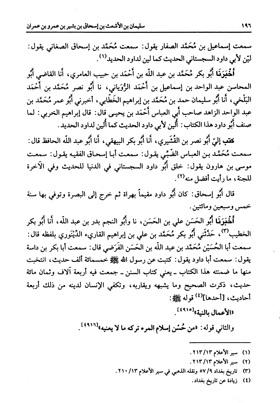 أخبرنا أبو بكر محمد بن عبد الله بن أحمد بن حبيب العامري أنا القاضي أبو المحاسن عبد الواحد بن إسماعيل بن أحمد الروياني نا أبو نصر محمد بن أحمد البلخي أنا أبو سليمان حمد بن محمد بن إبراهيم الخطابي أخبرني أبو عمر محمد بن عبد الواحد الزاهد صاحب أبي العباس أحمد بن يحيى قال قال إبراهيم الحربي لما صنف أبو داود هذا الكتاب ألين لأبي داود الحديث كما ألين لداود الحديد كتب إلي أبو نصر بن القشيري أنا أبو بكر البيهقي أنا أبو عبد الله الحافظ قال سمعت محمد بن العباس الضبي يقول سمعت أبا إسحاق الفقيه يقول سمعت موسى بن هارون يقول خلق أبو داود السجستاني في الدنيا للحديث وفي الآخرة للجنة ما رأيت أفضل منه (2)