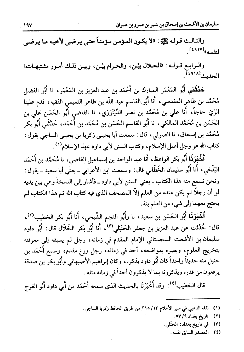 والثالث قوله (صلى الله عليه وسلم) لا يكون المؤمن مؤمنا حتى يرضى لأخيه ما يرضى لنفسه والرابع قوله الحلال بين والحرام بين وبين ذلك أمور مشتبهات الحديث حدثني أبو المعمر المبارك بن أحمد بن عبد العزيز بن المعمر نا أبو الفضل محمد بن طاهر المقدسي أنا أبو القاسم عبد الله بن طاهر التميمي الفقيه قدم علينا الري حاجا أنا علي بن محمد بن نصر الدينوري نا القاضي أبو الحسن علي بن الحسن بن محمد المالكي نا أبو القاسم الحسن بن محمد بن أحمد حدثني أبو بكر محمد بن إسحاق نا الصولي قال سمعت أبا يحيى زكريا بن يحيى الساجي يقول كتاب الله عز وجل أصل الإسلام وكتاب السنن لأبي داود عهد الإسلام (1)