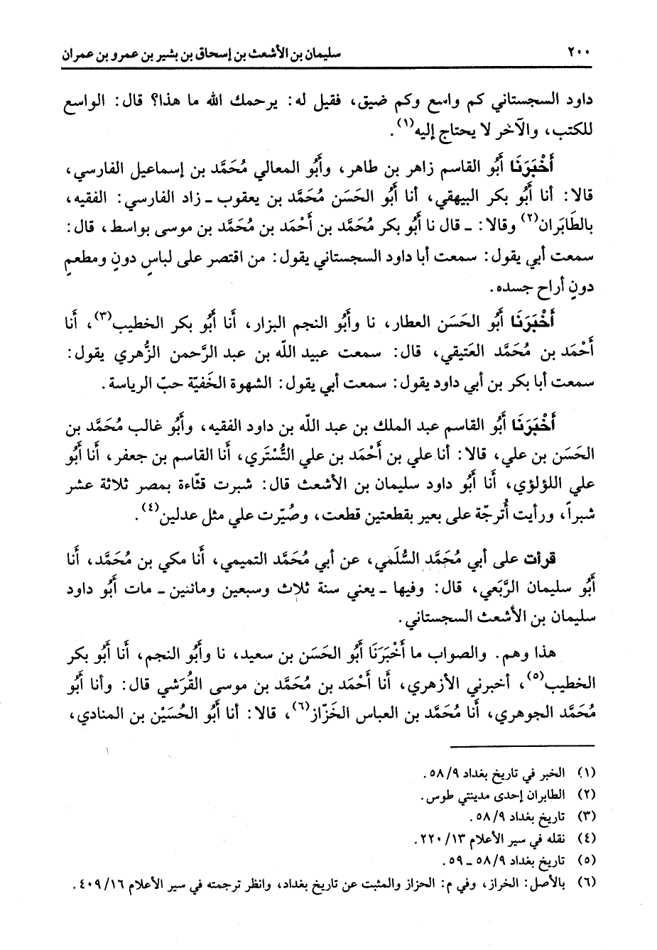 قرأت على أبي محمد السلمي عن أبي محمد التميمي أنا مكي بن محمد أنا أبو سليمان الربعي قال وفيها يعني سنة ثلاث وسبعين ومائتين مات أبو داود سليمان بن الأشعث السجستاني هذا وهم والصواب ما أخبرنا أبو الحسن بن سعيد نا وأبو النجم أنا أبو بكر الخطيب (5) أخبرني الأزهري أنا أحمد بن محمد بن موسى القرشي قال وأنا أبو محمد الجوهري أنا محمد بن العباس الخزاز (6) قالا أنا أبو الحسين بن المنادي