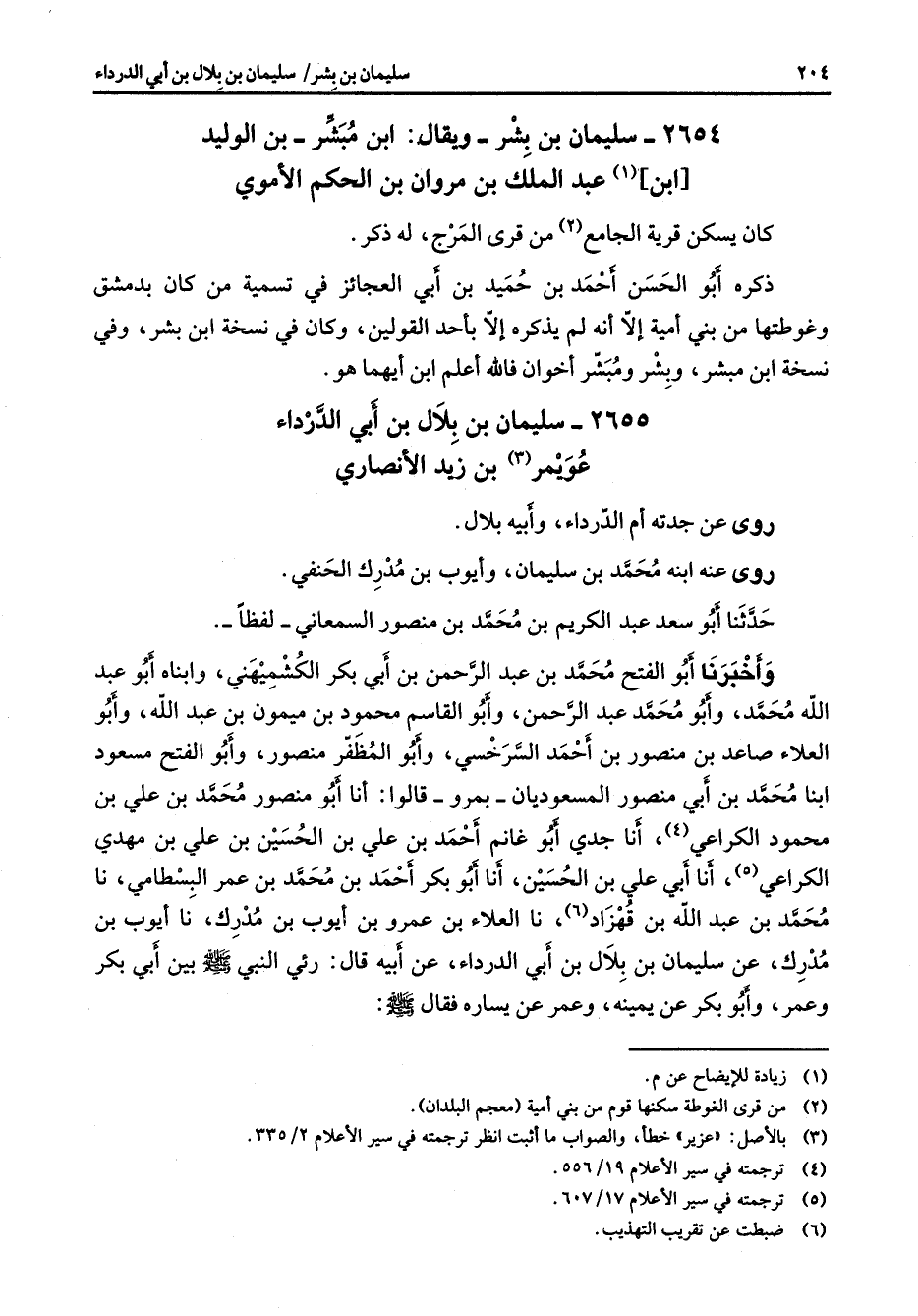 2654 - سليمان بن بشر ويقال ابن مبشر بن الوليد ابن (1) عبد الملك بن مروان بن الحكم الأموي كان يسكن قرية الجامع (2) من قرى المرج له ذكر ذكره أبو الحسن أحمد بن حميد بن أبي العجائز في تسمية من كان بدمشق وغوطتها من بني أمية إلا أنه لم يذكره إلا بأحد القولين وكان في نسخة ابن بشر وفي نسخة ابن مبشر وبشر ومبشر أخوان فالله أعلم ابن أيهما هو