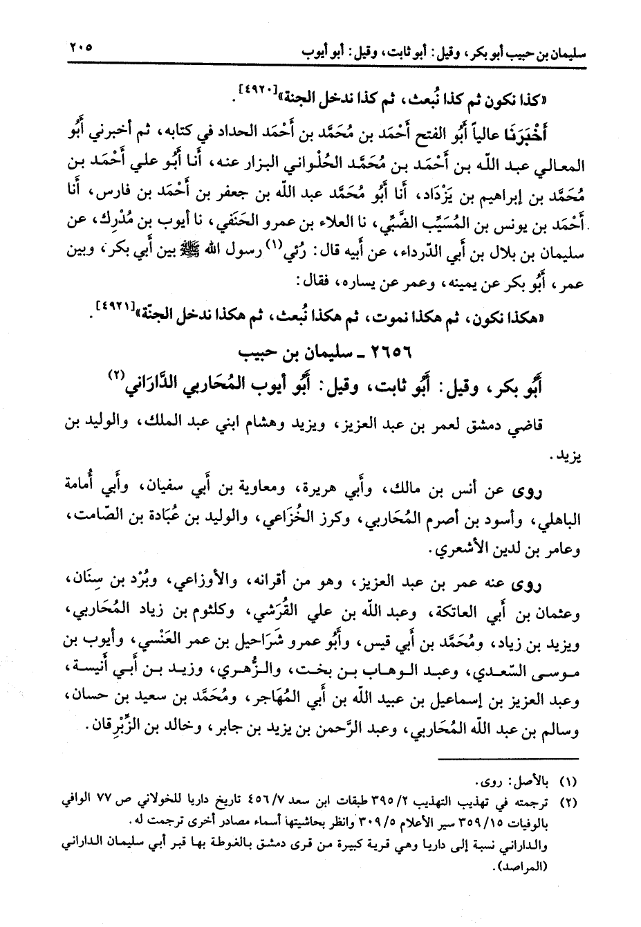 2656 - سليمان بن حبيب أبو بكر وقيل أبو ثابت وقيل أبو أيوب المحاربي الداراني (2) قاضي دمشق لعمر بن عبد العزيز ويزيد وهشام ابني عبد الملك والوليد بن يزيد روى عن أنس بن مالك وأبي هريرة ومعاوية بن أبي سفيان وأبي أمامة الباهلي وأسود بن أصرم المحاربي وكرز الخزاعي والوليد بن عبادة بن الصامت وعامر بن لدين الأشعري روى عنه عمر بن عبد العزيز وهو من أقرانه والأوزاعي وبرد بن سنان وعثمان بن أبي العاتكة وعبد الله بن علي القرشي وكلثوم بن زياد المحاربي ويزيد بن زياد ومحمد بن أبي قيس وأبو عمرو شراحيل بن عمر العنسي وأيوب بن موسى السعدي وعبد الوهاب بن بخت والزهري وزيد بن أبي أنيسة وعبد العزيز بن إسماعيل بن عبيد الله بن أبي المهاجر ومحمد بن سعيد بن حسان وسالم بن عبد الله المحاربي وعبد الرحمن بن يزيد بن جابر وخالد بن الزبرقان