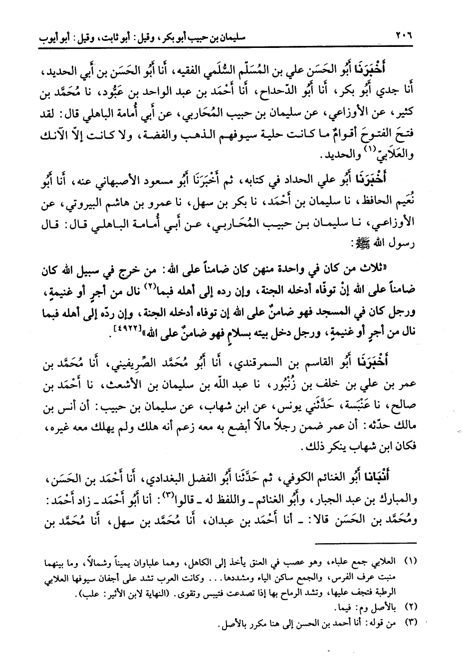 أخبرنا أبو الحسن علي بن المسلم السلمي الفقيه أنا أبو الحسن بن أبي الحديد أنا جدي أبو بكر أنا أبو الدحداح أنا أحمد بن عبد الواحد بن عبود نا محمد بن كثير عن الأوزاعي عن سليمان بن حبيب المحاربي عن أبي أمامة الباهلي قال لقد فتح الفتوح أقوام ما كانت حلية سيوفهم الذهب والفضة ولا كانت إلا الآنك والعلابي (1) والحديد أخبرنا أبو علي الحداد في كتابه ثم أخبرنا أبو مسعود الأصبهاني عنه أنا أبو نعيم الحافظ نا سليمان بن أحمد نا بكر بن سهل نا عمرو بن هاشم البيروتي عن الأوزاعي نا سليمان بن حبيب المحاربي عن أبي أمامة الباهلي قال قال رسول الله (صلى الله عليه وسلم) ثلاث من كان في واحدة منهن كان ضامنا على الله من خرج في سبيل الله كان ضامنا على الله إن توفاه أدخله الجنة وإن رده إلى أهله فبما (2) نال من أجر أو غنيمة ورجل كان في المسجد فهو ضامن على الله إن توفاه أدخله الجنة وإن رده إلى أهله فبما نال من أجر أو غنيمة ورجل دخل بيته بسلام فهو ضامن على الله أخبرنا أبو القاسم بن السمرقندي أنا أبو محمد الصريفيني أنا محمد بن عمر بن علي بن خلف بن زنبور نا عبد الله بن سليمان بن الأشعث نا أحمد بن صالح نا عنبسة حدثني يونس عن ابن شهاب عن سليمان بن حبيب أن أنس بن مالك حدثه أن عمر ضمن رجلا مالا أبضع به معه زعم أنه هلك ولم يهلك معه غيره فكان ابن شهاب ينكر ذلك أنبأنا أبو الغنائم الكوفي ثم حدثنا أبو الفضل البغدادي أنا أحمد بن الحسن والمبارك بن عبد الجبار وأبو الغنائم واللفظ له قالوا (3) أنا أبو أحمد زاد أحمد ومحمد بن الحسن قالا أنا أحمد بن عبدان أنا محمد بن سهل أنا محمد بن