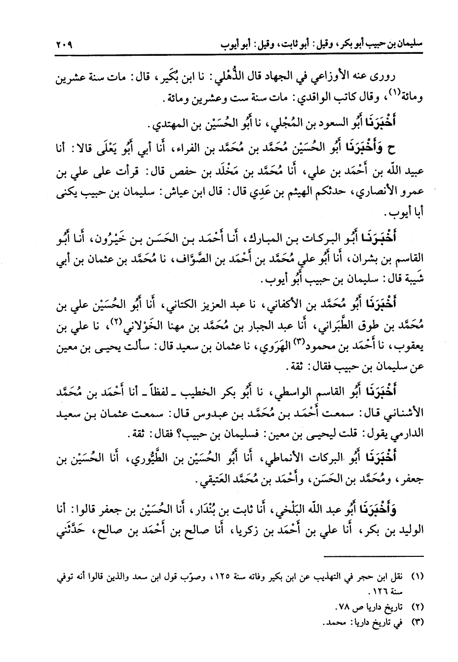 روى عنه الأوزاعي في الجهاد قال الذهلي نا ابن بكير قال مات سنة عشرين ومائة (1) وقال كاتب الواقدي مات سنة ست وعشرين ومائة أخبرنا أبو السعود بن المجلي نا أبو الحسين بن المهتدي ح وأخبرنا أبو الحسين محمد بن محمد بن الفراء أنا أبي أبو يعلى قالا أنا عبيد الله بن أحمد بن علي أنا محمد بن مخلد بن حفص قال قرأت على علي بن عمرو الأنصاري حدثكم الهيثم بن عدي قال قال ابن عياش سليمان بن حبيب يكنى أبا أيوب أخبرنا أبو البركات بن المبارك أنا أحمد بن الحسن بن خيرون أنا أبو القاسم بن بشران أنا أبو علي محمد بن أحمد بن الصواف نا محمد بن عثمان بن أبي شيبة قال سليمان بن حبيب أبو أيوب أخبرنا أبو محمد بن الأكفاني نا عبد العزيز الكتاني أنا أبو الحسين علي بن محمد بن طوق الطبراني أنا عبد الجبار بن محمد بن مهنا الخولاني (2) ناعلي بن يعقوب نا أحمد بن محمود (3) الهروي نا عثمان بن سعيد قال سألت يحيى بن معين عن سليمان بن حبيب فقال ثقة أخبرنا أبو القاسم الواسطي نا أبو بكر الخطيب لفظا أنا أحمد بن محمد الأشناني قال سمعت أحمد بن محمد بن عبدوس قال سمعت عثمان بن سعيد الدارمي يقول قلت ليحيى بن معين فسليمان بن حبيب فقال ثقة أخبرنا أبو البركات الأنماطي أنا أبو الحسين بن الطيوري أنا الحسين بن جعفر ومحمد بن الحسن وأحمد بن محمد العتيقي وأخبرنا أبو عبد الله البلخي أنا ثابت بن بندار أنا الحسين بن جعفر قالوا أنا الوليد بن بكر أنا علي بن أحمد بن زكريا أنا صالح بن أحمد بن صالح حدثني