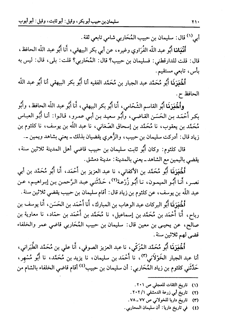 أبي (1) قال سليمان بن حبيب المحاربي شامي تابعي ثقة أنبأنا أبو عبد الله الفراوي وغيره عن أبي بكر البيهقي أنا أبو عبد الله الحافظ قال قلت للدارقطني فسليمان بن حبيب قال المحاربي قلت بلى قال ليس به بأس تابعي مستقيم أخبرنا أبو محمد عبد الجبار بن محمد الفقيه أنا أبو بكر البيهقي أنا أبو عبد الله الحافظ وأخبرنا أبو القاسم الشحامي أنا أبو بكر البيهقي أنا أبو عبد الله الحافظ وأبو بكر أحمد بن الحسن القاضي وأبو سعيد بن أبي عمرو قالوا أنا أبو العباس محمد بن يعقوب نا محمد بن إسحاق الصغاني نا عبد الله بن يوسف نا كلثوم بن زياد قال أدركت سليمان بن حبيب والزهري يقضيان بذلك يعني بشاهد ويمين قال كلثوم وكان أبو ثابت سليمان بن حبيب قاضي أهل المدينة ثلاثين سنة يقضي باليمين مع الشاهد يعني بالمدينة مدينة دمشق أخبرنا أبو محمد بن الأكفاني نا عبد العزيز بن أحمد أنا أبو محمد بن أبي نصر أنا أبو الميمون نا أبو زرعة (2) حدثني عبد الرحمن بن إبراهيم عن عبد الله بن يوسف عن كلثوم بن زياد قال أقام سليمان بن حبيب يقضي ثلاثين سنة أخبرنا أبو البركات عبد الوهاب بن المبارك أنا أحمد بن الحسن أنا يوسف بن رباح أنا أحمد بن محمد بن إسماعيل نا محمد بن أحمد بن حماد نا معاوية بن صالح عن يحيى بن معين قال سليمان بن حبيب المحاربي قاضي عمر والخلفاء قضى لهم ثلاثين سنة أخبرنا أبو محمد المزكي نا عبد العزيز الصوفي أنا علي بن محمد الطبراني أنا عبد الجبار الخولاني (3) نا أحمد بن سليمان نا يزيد بن محمد نا أبو مسهر حدثني كلثوم بن زياد المحاربي أن سليمان بن حبيب (4) أقام قاضي الخلفاء بالشام من