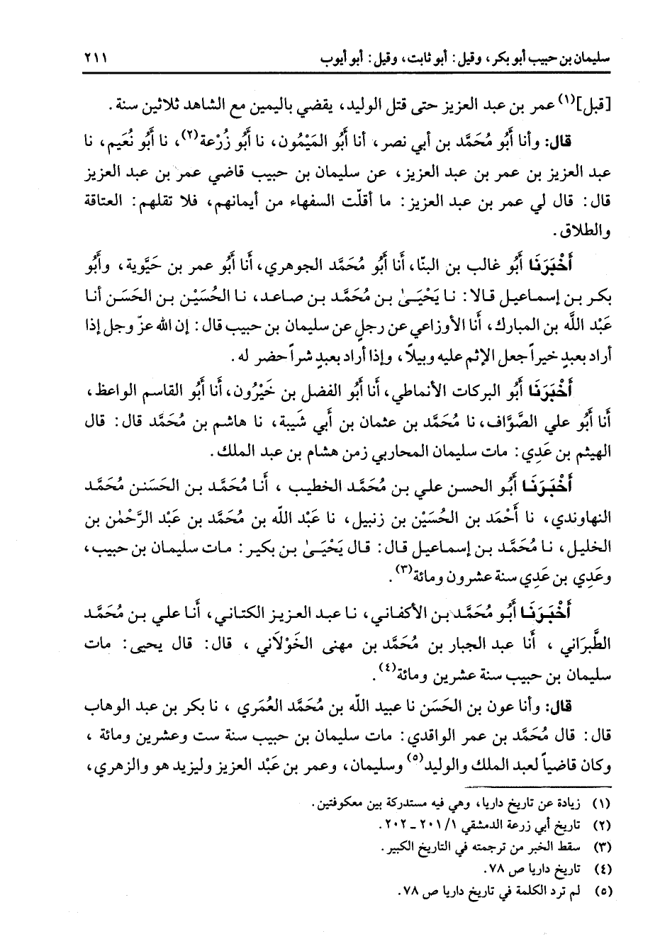 قال وأنا عون بن الحسن نا عبيد الله بن محمد العمري نا بكر بن عبد الوهاب قال قال محمد بن عمر الواقدي مات سليمان بن حبيب سنة ست وعشرين ومائة وكان قاضيا لعبد الملك والوليد (5) وسليمان وعمر بن عبد العزيز وليزيد هو والزهري