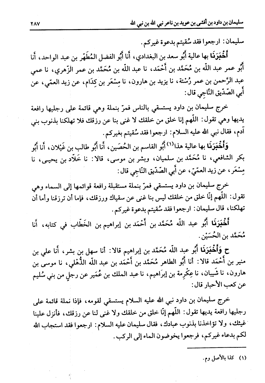 سليمان ارجعوا فقد سقيتم بدعوة غيركم أخبرنا بها عالية أبو سعد بن البغدادي أنا أبو الفضل المطهر بن عبد الواحد أنا أبو عمر عبد الله بن محمد بن أحمد نا عبد الله بن محمد بن عمر الزهري نا عمي عبد الرحمن بن عمر رستة نا يزيد بن هارون نا مسعر بن كدام عن زيد العمي عن أبي الصديق الناجي قال خرج سليمان بن داود يستسقي بالناس فمر بنملة وهي قائمة على رجليها رافعة يديها وهي تقول اللهم إنا خلق من خلقك لا غنى بنا عن رزقك فلا تهلكنا بذنوب بني ادم فقال نبي الله عليه السلام ارجعوا فقد سقيتم بغيركم وأخبرنا بها عالية هذا (1) أبو القاسم بن الحصين أنا أبو طالب بن غيلان أنا أبو بكر الشافعي نا محمد بن سليمان وبشر بن موسى قالا نا خلاد بن يحيى نا مسعر عن زيد العمي عن أبي الصديق الناجي قال خرج سليمان بن داود يستسقي فمر بنملة مستقبلة رافعة قوائمها إلى السماء وهي تقول اللهم إنا خلق من خلقك ليس بنا غنى عن سقياك ورزقك فإما أن ترزقنا وأما أن تهلكنا قال سليمان ارجعوا فقد سقيتم بدعوة غيركم أخبرنا أبو عبد الله محمد بن أحمد بن إبراهيم بن الخطاب في كتابه أنا محمد بن الحسين ح وأخبرنا أبو عبد الله محمد بن إبراهيم قالا أنا سهل بن بشر أنا علي بن منير بن أحمد قالا أنا أبو الطاهر محمد بن أحمد بن عبد الله الذهلي نا موسى بن هارون نا شيبان نا عكرمة بن إبراهيم نا عبد الملك بن عمير عن رجل من بني سليم عن كعب الأحبار قال خرج سليمان بن داود نبي الله عليه السلام يستسقي لقومه فإذا نملة قائمة على رجليها رافعة يديها تقول اللهم إنا خلق من خلقك ولا غنى لنا عن رزقك فأنزل علينا غيثك ولا تؤاخذنا بذنوب عبادك فقال سليمان عليه السلام ارجعوا فقد استجاب الله لكم بدعاء غيركم فرجعوا يخوضون الماء إلى الركب