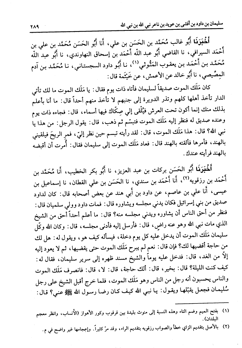 أخبرنا أبو غالب محمد بن الحسن بن علي أنا أبو الحسن محمد بن علي بن أحمد السيرافي نا القاضي أبو عبد الله أحمد بن إسحاق النهاوندي نا أبو عبد الله محمد بن أحمد بن يعقوب المتوثي (1) نا أبو داود السجستاني نا محمد بن ادم المصيصي نا أبو خالد عن الأعمش عن خيثمة قال كان ملك الموت صديقا لسليمان فأتاه ذات يوم فقال يا ملك الموت ما لك تأتي الدار تأخذ أهلها كلهم وتذر الدويرة إلى جنبهم لا تأخذ منهم أحدا قال ما أنا بأعلم بذلك منك إنما أكون تحت العرش فيلقى إلي صكاك فيها أسماء قال فجاءه ذات يوم وعنده صديق له فنظر إليه ملك الموت فتبسم ثم ذهب قال يقول الرجل من هذا يا نبي الله قال هذا ملك الموت قال لقد رأيته تبسم حين نظر إلي فمر الريح فيلقيني بالهند فأمرها فألقته بالهند قال فعاد ملك الموت إلى سليمان فقال أمرت أن أقبضه بالهند فرأيته عندك أخبرنا أبو الحسن بركات بن عبد العزيز نا أبو بكر الخطيب أنا محمد بن أحمد بن رزقويه (2) أنا أحمد بن سندي نا الحسن بن علي القطان نا إسماعيل بن عيسى أنا علي بن عاصم عن داود بن أبي هند عن بعض أصحابه قال كان لداود صديق من بني إسرائيل فكان يدني مجلسه ويشاوره قال فمات داود وولي سليمان قال فنظر من أحق الناس أن يشاور هو يدني مجلسه منه قال ما أعلم أحدا أحق من الشيخ الذي مات نبي الله وهو عنه راض قال فأرسل إليه فأدنى مجلسه قال وكان الله وكل سليمان ملك الموت أن يدخل عليه كل يوم دخله فيسأله كيف هو ويقول له هل لك من حاجة أقضيها لك فإن قال نعم لم يبرح ملك الموت حتى يقضيها ثم لا يعود إليه إلا من الغد قال فدخل عليه يوما والشيخ مسند ظهره إلى سرير سليمان فقال له كيف كنت الليله قال بخير قال ألك حاجة قال لا قال فانصرف ملك الموت والناس يحسبون أنه رجل من الناس وهو ملك الموت فلما خرج أقبل الشيخ على رجل سليمان فجعل يقبلها ويقول يا نبي الله كيف كان رضا رسول الله (صلى الله عليه وسلم) عني قال