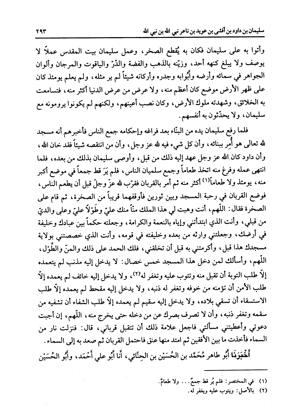 وأتوا به على سليمان فكان به يقطع الصخر وعمل سليمان بيت المقدس عملا لا يوصف ولا يبلغ كنهه أحد وزينه بالذهب والفضة والدر والياقوت والمرجان وألوان الجواهر في سمائه وأرضه وأبوابه وجدره وأركانه شيئا لم ير مثله ولم يعلم يومئذ كان على ظهر الأرض موضع كان أعظم منه ولا عرض من عرض الدنيا أكثر منه فتسامعت به الخلائق وشهدته ملوك الأرض وكان نصب أعينهم ولكنهم لم يكونوا يرومونه مع سليمان ولا يحدثون به أنفسهم فلما رفع سليمان يده من البناء بعد فراغه وإحكامه جمع الناس فأخبرهم أنه مسجد لله تعالى هو أمر ببنائه وأن كل شئ فيه لله عز وجل وأن من انتقصه شيئا فقد خان الله وأن داود كان الله عز وجل عهد إليه ذلك من قبل وأوصى سليمان بذلك من بعده فلما انتهى عمله وفرغ منه اتخذ طعاما وجمع سليمان الناس فلم يرقط جمعا في موضع أكبر منه يومئذ ولا طعاما (1) أكثر منه ثم أمر بالقربان فقرب لله عز وجل قبل أن يطعم الناس فوضع القربان في رحبه المسجد وبين ثورين فأوقفهما قريبا من الصخرة ثم قام على الصخرة فقال اللهم أنت وهبت لي هذا الملك منا منك علي وطولا علي وعلي والدي من قبلي وأنت الذي ابتدأتني وإياه بالنعمة والكرامة وجعلته حكما بين عبادك وخليفة في أرضك وجعلتني وارثه من بعده وخليفته في قومه وأنت الذي خصصتني بولاية مسجدك هذا قبل وأكرمتني به قبل أن تخلقني فلك الحمد على ذلك والمن والطول اللهم وأسألك لمن دخل هذا المسجد خمس خصال لا يدخل إليه مذنب لم يتعمده إلا طلب التوبة أن تقبل منه وتتوب عليه وتغفر له (2) ولا يدخل إليه خائف لم يعمده إلا خائف لم يعمده إلا طلب الأمن أن تؤمنه من خوفه وتغفر له ذنبه ولا يدخل إليه مقحط لم يعمده إلا طلب الاستسقاء أن تسقي بلاده ولا يدخل إليه سقيم لم يعمده إلا طلب الشفاء أن تشفيه من سقمه وتغفر ذنبه وأن لاتصرف بصرك عن من دخله حتى يخرج منه اللهم إن أجبت دعوتي وأعطيتني مسألتي فاجعل علامة ذلك أن تتقبل قرباني قال فنزلت نار من السماء فأخذت مابين الأفقين ثم امتد منها عنق فاحتمل القربان ثم صعد به إلى السماء أخبرنا أبو طاهر محمد بن الحسين بن الحنائي أنا أبو علي أحمد وأبو الحسين