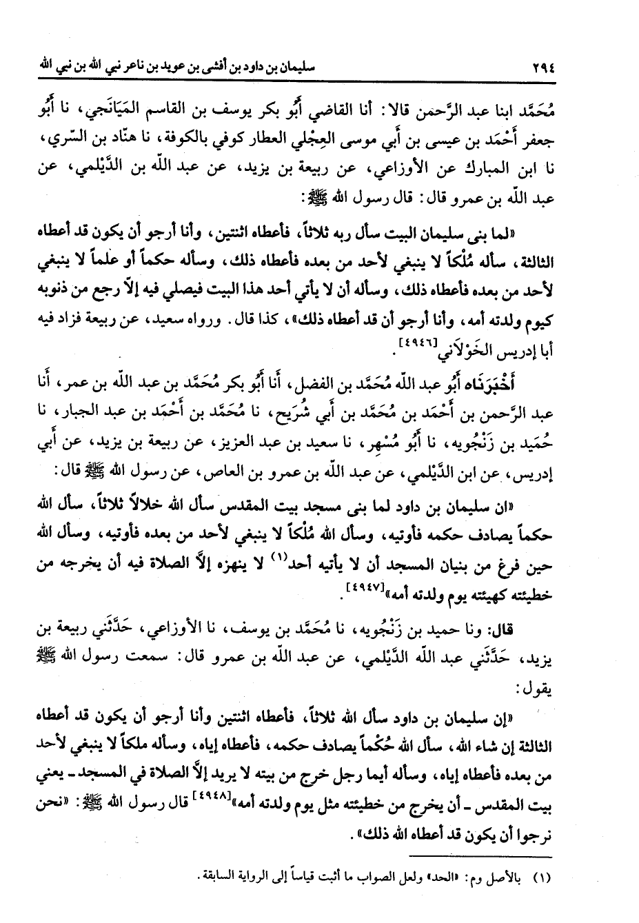 محمد ابنا عبد الرحمن قالا أنا القاضي أبو بكر يوسف بن القاسم الميانجي نا أبو جعفر أحمد بن عيسى بن أبي موسى العجلي العطار كوفي بالكوفة نا هناد بن السري نا ابن المبارك عن الأوزاعي عن ربيعة بن يزيد عن عبد الله بن الديلمي عن عبد الله بن عمرو قال قال رسول الله (صلى الله عليه وسلم) لما بنى سليمان البيت سأل ربه ثلاثا فأعطاه اثنتين وأنا أرجوا أن يكون قد أعطاه الثالثة سأله ملكا لا ينبغي لأحد من بعده فأعطاه ذلك وسأله حكما أو علما لا ينبغي لأحد من بعده فأعطاه ذلك وسأله أن لا يأتي أحد هذا البيت فيصلي فيه إلا رجع من ذنوبه كيوم ولدته أمه وأنا أرجو أن قد أعطاه ذلك كذا قال ورواه سعيد عن ربيعة فزاد فيه أبا إدريس الخولاني أخبرناه أبو عبد الله محمد بن الفضل أنا أبو بكر محمد بن عبد الله بن عمر أنا عبد الرحمن بن أحمد بن محمد بن أبي شريح نا محمد بن أحمد بن عبد الجبار نا حميد بن زنجويه نا أبو مسهر نا سعيد بن عبد العزيز عن ربيعة بن يزيد عن أبي إدريس عن ابن الديلمي عن عبد الله بن عمرو بن العاص عن رسول الله (صلى الله عليه وسلم) قال ان سليمان بن داود لما بنى مسجد بيت المقدس سأل الله خلالا ثلاثا سأل الله حكما يصادف حكمه فأوتيه وسأل الله ملكا لا ينبغي لأحد من بعده فأويته وسأل الله حين فرغ من بنيان المسجد أن لا يأتيه أحد (1) لا ينهزه إلا الصلاة فيه أن يخرجه من خطيئته كهيئته يوم ولدته أمه قال ونا حميد بن زنجويه نا محمد بن يوسف نا الأوزاعي حدثني ربيعة بن يزيد حدثني عبد الله الديلمي عن عبد الله بن عمرو قال سمعت رسول الله (صلى الله عليه وسلم) يقول إن سليمان بن داود سأل الله ثلاثا فأعطاه اثنتين وأنا أرجوا أن يكون قد أعطاه الثالثة إن شاء الله سأل الله حكما يصادف حكمه فأعطاه إياه وسأله ملكا لا ينبغي لأحد من بعده فأعطاه إياه وسأله أيما رجل خرج من بيته لا يريد إلا الصلاة في المسجد يعني بيت المقدس أن يخرج من خطيئته مثل يوم ولدته أمه قال رسول الله (صلى الله عليه وسلم) نحن نرجوا أن يكون قد أعطاه الله ذلك