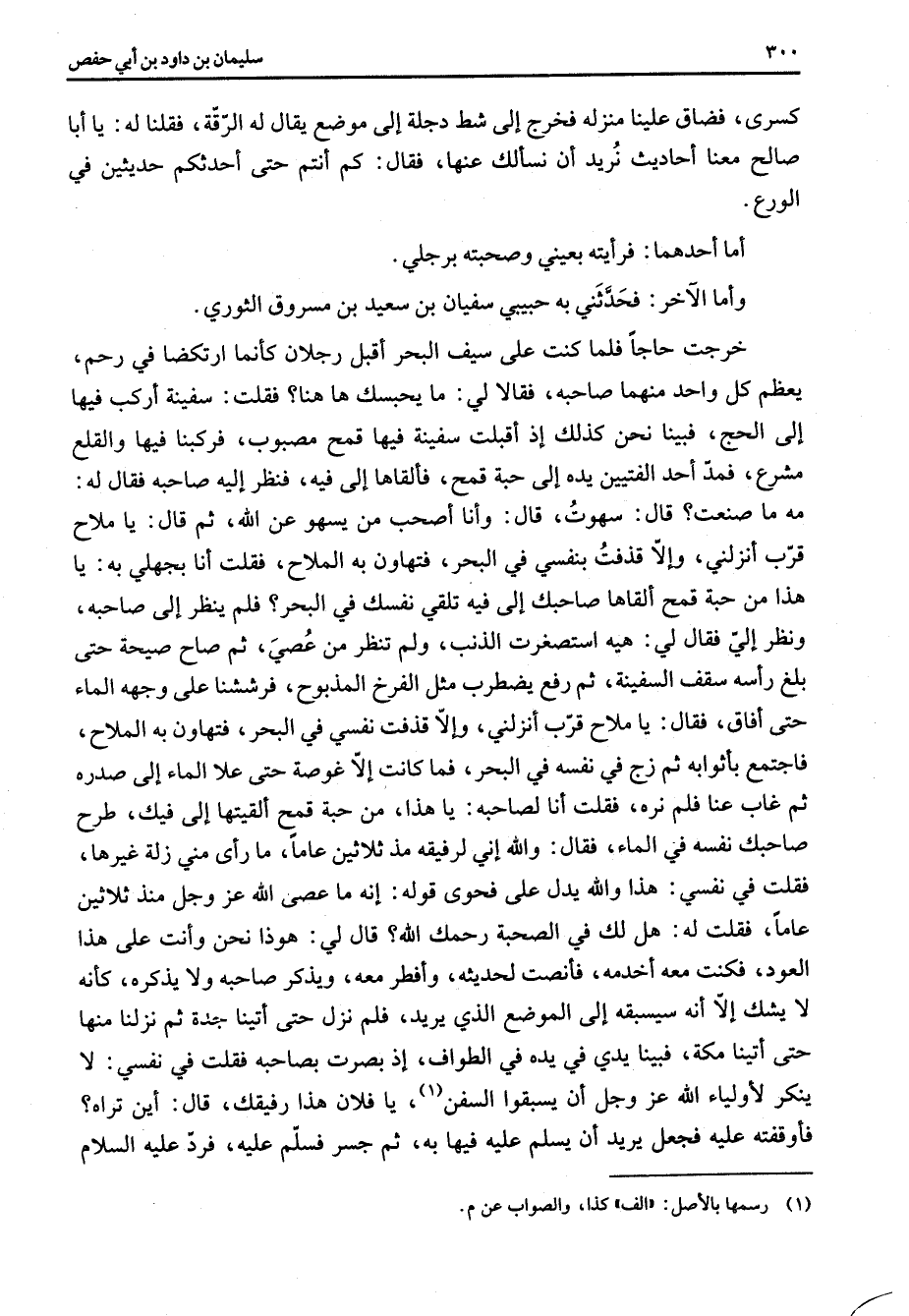كسرى فضاق علينا منزله فخرج إلى شط دجلة إلى موضع يقال له الرقة فقلنا له يا أبا صالح معنا أحاديث نريد أن نسألك عنها فقال كم أنتم حتى أحدثكم حديثين في الورع أما أحدهما فرأيته بعيني وصحبته برجلي وأما الاخر فحدثني به حبيبي سفيان بن سعيد بن مسروق الثوري خرجت حاجا فلما كنت على سيف البحر أقبل رجلان كأنما ارتكضا في رحم يعظم كل واحد منهما صاحبه فقالا لي ما يحبك ها هنا فقلت سفينة أركب فيها إلى الحج فبينا نحن كذلك إذ أقبلت سفينة فيها قمح مصبوب فركبنا فيها والقلع مشرع فمد أحد الفتيين يده إلى حبة قمح فألقاها إلى فيه فنظر إليه صاحبة فقال له مه ما صنعت قال سهوت قال وأنا أصحب من يسهو عن الله ثم قال يا ملاح قرب أنزلني وإلا قذفت بنفسي في البحر فتهاون به الملاح فقلت أنا بجهلي به يا هذا من حبة قمح ألقاها صاحبك إلى فيه تلقي نفسك في البحر فلم ينظر إلى صاحبه ونظر إلي فقال لي هيه استصغرت الذنب ولم تنظر من عصي ثم صاح صيحة حتى بلغ رأسه سقف السفينة ثم رفع يضطرب مثل الفرخ المذبوح فرششنا على وجهه الماء حتى أفاق فقال يا ملاح قرب أنزلني وإلا قذفت نفسي في البحر فتهاون به الملاح فاجتمع بأثوابه ثم زج في نفسه في البحر فما كانت إلا غوصة حتى علا الماء إلى صدره ثم غاب عنا فلم نره فقلت أنا لصاحبه يا هذا من حبة قمح ألقيتها إلى فيك طرح صاحبك نفسه في الماء فقال والله إني لرفيقه مذ ثلاثين عاما ما أرى مني زلة غيرها فقلت في نفسي هذا والله يدل على فحوى قوله إنه ما عصى الله عز وجل منذ ثلاثين عاما فقلت له هل لك في الصحبة رحمك الله قال لي هوذا نحن وأنت على هذا العود فكنت معه أخدمه فأنصت لحديثه وأفطر معه ويذكر صاحبه ولا يذكره كأنه لا يشك إلا أنه سيسبقه إلى الموضع الذي يريد فلم نزل حتى أتينا جده ثم نزلنا منها حتى أتينا مكة فبينا يدي في يده في الطواف إذ بصرت بصاحبه فقلت في نفسي لا ينكر لأولياء الله عز وجل أن يسبقوا السفن (1) يا فلان هذا رفيقك قال أين تراه فأوقفته عليه فجعل يريد أن يسلم عليه فيها به ثم جسر فسلم عليه فرد عليه السلام