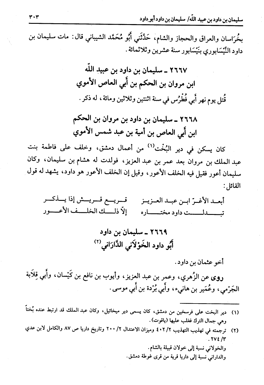 2667 - سليمان بن داود بن عبيد الله ابن مروان بن الحكم بن أبي العاص الأموي قتل يوم نهر أبي فطرس في سنة اثنتين وثلاثين ومائة له ذكر