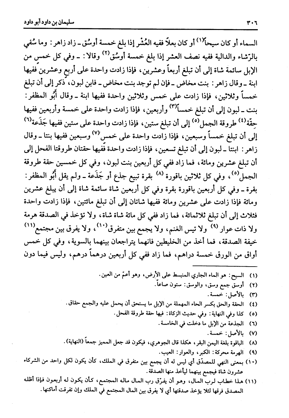 السماء أو كان سيحا (1) أو كان بعلا ففيه العشر إذا بلغ خمسة أوسق زاد زاهر وما سقي بالرشاء والدالية ففيه نصف العشر إذا بلغ خمسة أوسق (2) وقالا وفي كل خمس من الإبل سائمة شاة إلى أن تبلغ أربعا وعشرين فإذا زادت واحدة على أربع وعشرين ففيها ابنه وقال زاهر بنت مخاض فإن لم توجد بنت مخاض فابن لبون ذكر إلى أن تبلغ خمسا وثلاثين فإذا زادت على خمس وثلاثين واحدة ففيها ابنه وقال أبو المظفر بنت لبون إلى أن تبلغ خمسا (3) وأربعين فإذا زادت واحدة على خمسة وأربعين ففيها حقه (4) طروقة الجمل (5) إلى أن تبلغ ستين فإذا زادت واحدة على ستين ففيها جذعة (6) إلى أن تبلغ خمسا وسبعين فإذا زادت واحدة على خمس (7) وسبعين ففيها بنتا وقال زاهر ابنتا لبون إلى أن تبلغ تسعين فإذا زادت واحدة ففيها حقتان طروقتا الفحل إلى أن تبلغ عشرين ومائة فما زاد ففي كل أربعين بنت لبون وفي كل خمسين حقة طروقة الجمل (5) وفي كل ثلاثين باقورة (8) بقرة تبيع جذع أو جذعة ولم يقل أبو المظفر بقرة وفي كل أربعين باقورة بقرة وفي كل أربعين شاة سائمة شاة إلى أن يبلغ عشرين ومائة فإذا زادت على عشرين ومائة ففيها شاتان إلى أن تبلغ مائتين فإذا زادت واحدة فثلاث إلى أن تبلغ ثلاثمائة فما زاد ففي كل مائة شاة شاة ولا تؤخذ في الصدقة هرمة ولا ذات عوار (9) ولا تيس الغنم ولا يجمع بين متفرق (10) ولا يفرق بين مجتمع (11) خيفة الصدقة فما أخذ من الخليطين فانهما يتراجعان بينهما بالسوية وفي كل خمس أواق من الورق خمسة دراهم فما زاد ففي كل أربعين درهما درهم وليس فيما دون