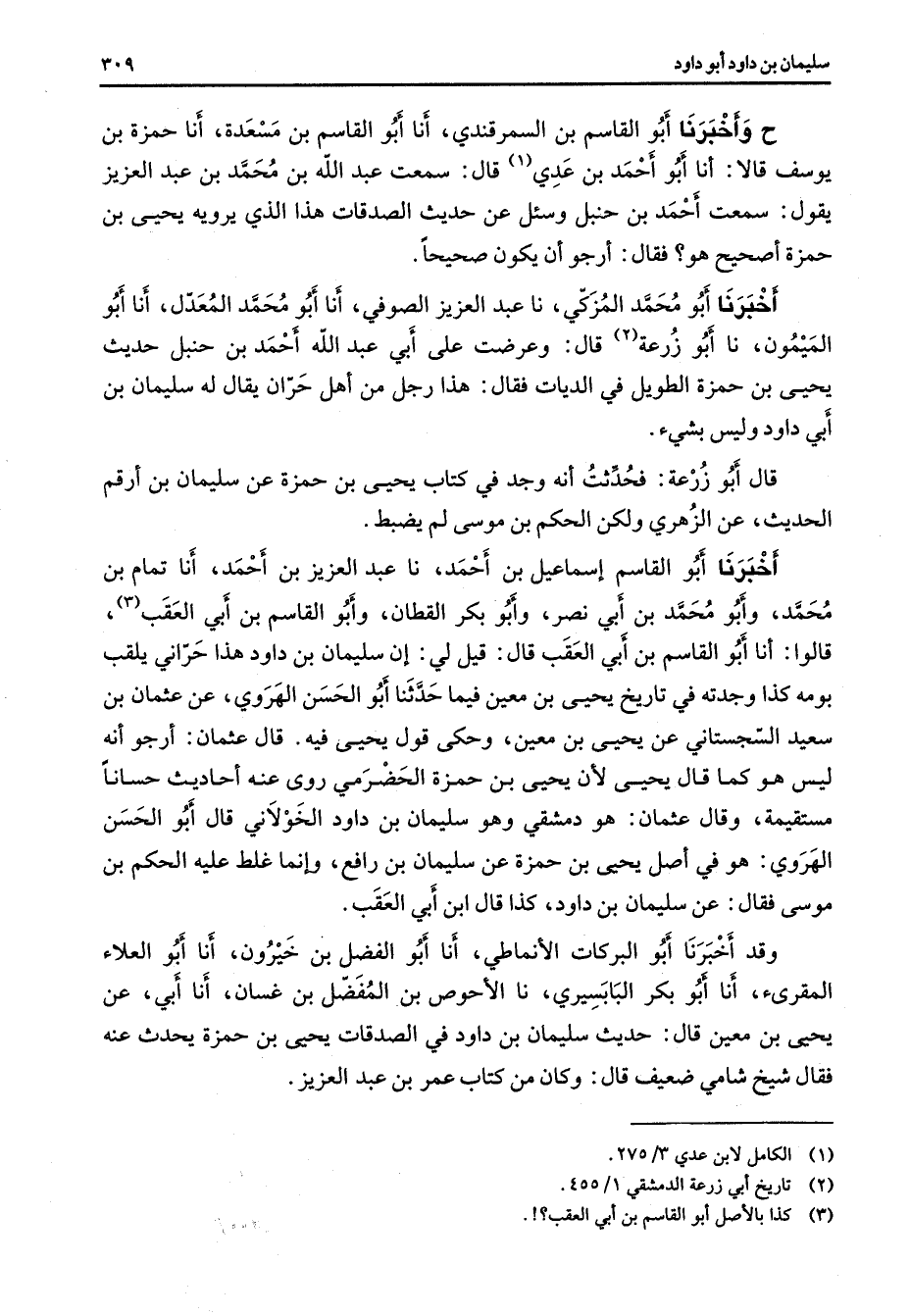 ح وأخبرنا أبو القاسم بن السمرقندي أنا أبو القاسم بن مسعدة أنا حمزة بن يوسف قالا أنا أبو أحمد بن عدي (1) قال سمعت عبد الله بن محمد بن عبد العزيزيقول سمعت أحمد بن حنبل وسئل عن حديث الصدقات هذا الذي يرويه يحيى بن حمزة أصحيح هو فقال أرجو أن يكون صحيحا أخبرنا أبو محمد المزكي نا عبد العزيز الصوفي أنا أبو محمد المعدل أنا أبو الميمون نا أبو زرعة (2) قال وعرضت على أبي عبد الله أحمد بن حنبل حديث يحيى بن حمزة الطويل في الديات فقال هذا رجل من أهل حران يقال له سليمان بن أبي داود وليس بشئ قال أبو زرعة فحدثت أنه وجد في كتاب يحيى بن حمزة عن سليمان بن أرقم الحديث عن الزهري ولكن الحكم بن موسى لم يضبط أخبرنا أبو القاسم إسماعيل بن أحمد نا عبد العزيز بن أحمد أنا تمام بن محمد وأبو محمد بن أبي نصر وأبو بكر القطان وأبو القاسم بن أبي العقب (3) قالوا أنا أبو القاسم بن أبي العقب قال قيل لي إن سليمان بن داود هذا حراني يلقب بومه كذا وجدته في تاريخ يحيى بن معين فيما حدثنا أبو الحسن الهروي عن عثمان بن سعيد السجستاني عن يحيى بن معين وحكى قول يحيى فيه قال عثمان أرجو أنه ليس هو كما قال يحيى لأن يحيى بن حمزة الحضرمي روى عنه أحاديث حسانا مستقيمة وقال عثمان هو دمشقي وهو سليمان بن داود الخولاني قال أبو الحسن الهروي هو في أصل يحيى بن حمزة عن سليمان بن رافع وإنما غلط عليه الحكم بن موسى فقال عن سليمان بن داود كذا قال ابن أبي العقب وقد أخبرنا أبو البركات الأنماطي أنا أبو الفضل بن خيرون أنا أبو العلاء المقرئ أنا أبو بكر البابسيري نا الأحوص بن المفضل بن غسان أنا أبي عن يحيى بن معين قال حديث سليمان بن داود في الصدقات يحيى بن حمزة يحدث عنه فقال شيخ شامي ضعيف قال وكان من كتاب عمر بن عبد العزيز