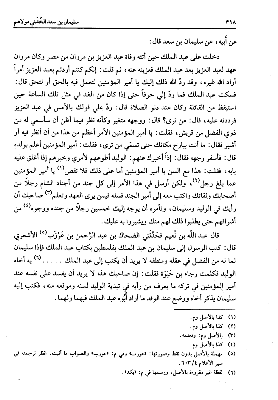 عن أبيه عن سليمان بن سعد قال دخلت على عبد الملك حين أتته وفاة عبد العزيز بن مروان من مصر وكان مروان عهد لعبد العزيز بعد عبد الملك فعزيته عنه ثم قلت إنكم كنتم أردتم يعبد العزيز أمرا أراد الله غيره وقد رد الله ذلك إليك يا أمير المؤمنين لتعمل فيه بالحق أو لتحق قال فسكت عبد الملك فما رد إلي حرفا حتى إذا كان من الغد في مثل تلك الساعة حين استيقظ من القائلة وكان عند دنو الصلاة قال رد علي قولك بالأمس في عبد العزيز فرددته عليه قال من ترى قال ووجهه متغير وكأنه نظر فيما أظن أن سأسمي له من ذوي الفضل من قريش فقلت يا أمير المؤمنين الأمر أعظم من هذا من أن أنظر فيه أو أشير فقال ما أنت ببارح مكانك حتى تسمي من ترى فقلت أمير المؤمنين أعلم بولده قال فأسفر وجهه فقال إذا أخبرك عنهم الوليد أطوعهم لأمري وخيرهم إذا أغلق عليه بابه فقلت هذا مع السن يا أمير المؤمنين أما على ذلك فلا تقص (1) يا أمير المؤمنين عما بلغ رجل (2) ولكن أرسل في هذا الأمر إلى كل جند من أجناد الشام رجلا من أصحابك وثقاتك واكتب معه إلى أمير الجند فسله فيمن يرى العهد وتعلم (3) صاحبك أن رأيك في الوليد وسليمان وتأمره أن يوجه إليك خمسين رجلا من جنده ووجوه (4) من أشرافهم حتى يطلبوا ذلك لهم منك ويشيروا به عليك قال عبد الله بن نعيم فحدثني الضحاك بن عبد الرحمن بن عرزب (5) الأشعري قال كتب الرسول إلى سليمان بن عبد الملك بفلسطين بكتاب عبد الملك فإذا سليمان لما له من الفضل في عقله ومنطقه لا يريد أن يكتب إلى عبد الملك (6) به أخاه الوليد فكلمت رجاء بن حيوة فقلت إن صاحبك هذا لا يريد أن يفسد على نفسه عند أمير المؤمنين في تركه ما يعرف من رأيه في تبديه الوليد لسنة وموقعه منه فكتب إليه سليمان يذكر أخاه ووضع عند الوفد ما أراد أبوه عبد الملك فيهما ولهما