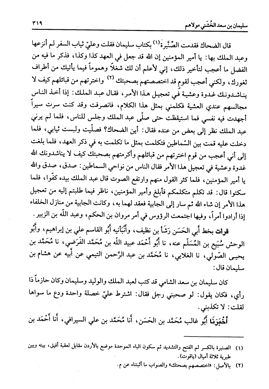 قال الضحاك فقدمت الصنبرة (1) بكتاب سليمان فقلت وعلي ثياب السفر لم أنزعها وعبد الملك بها يا أمير المؤمنين إن الله قد جعل في العهد كذا وكذا فذكر ما فيه من الفضل ما أعجب لتأخير ذلك إني لأعلم أن لك شغلا وهموما فيما يأتيك من أطراف ثغورك ولكني أعجب لقوم قد أختصصتهم بصحبتك (2) واخترتهم من قبائلهم كيف لا يناشدونك غدوة وعشية في تعجيل هذا الأمر فقال عبد الملك إذا أخذ الناس مجالسهم عندي العشية فكلمني بمثل هذا الكلام فانصرفت وقد كنت سرت سيرا أجهدت فيه نفسي فما استيقظت حتى صلى عبد الملك وجلس للناس فلما لم يرني عبد الملك نظر إلى بعض من عنده فقال أين الضحاك فصليت ولبست ثيابي فلما دخلت عليه قمت بين السماطين فتكلمت بمثل ما تكلمت به في ذكر العهد فلما بلغت إلى أني أعجب من قوم اخترتهم من قبائلهم وأكرمتهم بصحبتك كيف لا يناشدونك الله غدوة وعشية في تعجيل هذا الأمر فقال الناس من نواحي السماطين صدق صدق والله يا أمير المؤمنين فلما كثر القول منهم وارتفع الصوت قال عبد الملك بيده كفوا فلما سكتوا قال قد تكلم متكلمكم فأبلغ وأمير المؤمنين ناظر فيما طلبتم إليه من تعجيل هذا الأمر إن شاء الله ثم سار إلى الجابية فعقد لهما به وكانت الجابية من منازل الخلفاء إذا أرادوا أمرا وفيها اجتمعت الرؤوس في أمر مروان بن الحكم وعبد الله بن الزبير قرأت بخط أبي الحسن رشأ بن نظيف وأنبأنيه أبو القاسم علي بن إبراهيم وأبو الوحش سبيع بن المسلم عنه نا أبو أحمد عبيد الله بن محمد الفرضي نا محمد بن يحيى الصولي نا الغلابي نا محمد بن عبد الرحمن التيمي عن أبيه عن هشام بن سليمان قال كان سليمان بن سعد الشامي قد كتب لعبد الملك والوليد وسليمان وكان حازما ذا رأي فكان يقول لو صحبني رجل فقال اشترط علي خصلة واحدة ودع ما سواها لقلت لا تكذبني أخبرنا أبو غالب محمد بن الحسن أنا محمد بن علي السيرافي أنا أحمد بن