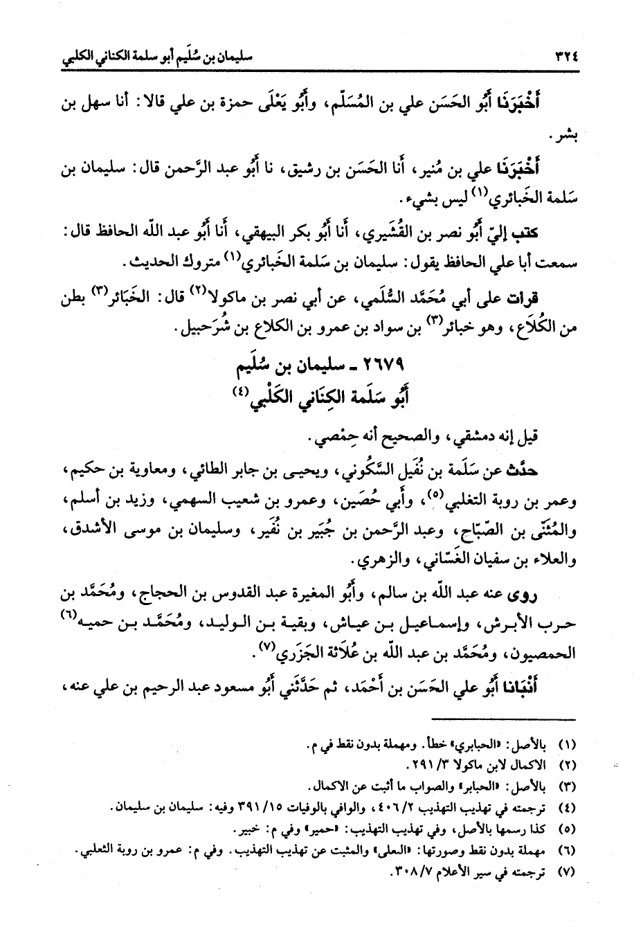 أخبرنا أبو الحسن علي بن المسلم وأبو يعلى حمزة بن علي قالا أنا سهل بن بشر أخبرنا علي بن منير أنا الحسن بن رشيق نا أبو عبد الرحمن قال سليمان بن سلمة الخبائري (1) ليس بشئ كتب إلي أبو نصر بن القشيري أنا أبو بكر البيهقي أنا أبو عبد الله الحافظ قال سمعت أبا علي الحافظ يقول سليمان بن سلمة الخبائري (1) متروك الحديث قرأت على أبي محمد السلمي عن أبي نصر بن ماكولا (2) قال الخبائر (3) بطن من الكلاع وهوخبائر بن سواد بن عمرو بن الكلاع بن شرحبيل