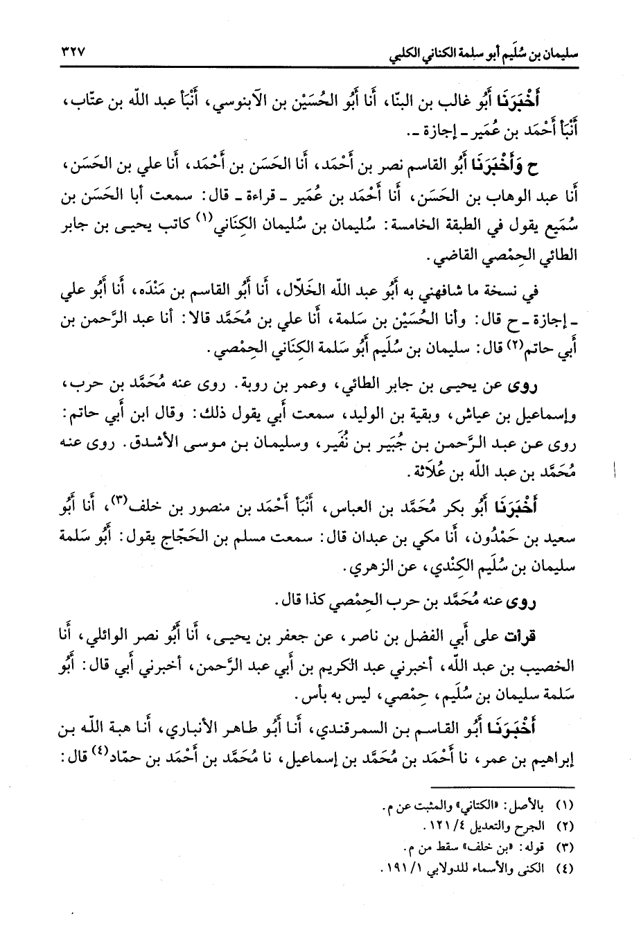 أخبرنا أبو غالب بن البنا أنا أبو الحسين بن الابنوسي أنبأ عبد الله بن عتاب أنبأ أحمد بن عمير إجازة ح وأخبرنا أبو القاسم نصر بن أحمد أنا الحسن بن أحمد أنا علي بن الحسن أنا عبد الوهاب بن الحسن أنا أحمد بن عمير قراءة قال سمعت أبا الحسن بن سميع يقول في الطبقة الخامسة سليمان بن سليمان الكناني (1) نا بن يحيى بن جابر الطائي الحمصي القاضي في نسخة ما شافهني به أبو عبد الله الخلال أنا أبو القاسم بن مندة أنا أبو علي إجازة قال وأنا الحسين بن سلمة أنا علي بن محمد قالا أنا عبد الرحمن بن أبي حاتم (2) قال سليمان بن سليم أبو سلمة الكناني الحمصي روى عن يحيى بن جابر الطائي وعمر بن روبة روى عنه محمد بن حرب وإسماعيل بن عياش وبقية بن الوليد سمعت أبي يقول ذلك وقال ابن أبي حاتم روى عن عبد الرحمن بن جبير بن نفير وسليمان بن موسى الأشدق روى عنه محمد بن عبد الله بن علاثة أخبرنا أبو بكر محمد بن العباس أنبأ أحمد بن منصور بن خلف (3) أنا أبو سعيد بن حمدون أنا مكي بن عبدان قال سمعت مسلم بن الحجاج يقول أبو سلمة سليمان بن سليم الكندي عن الزهري روى عنه محمد بن حرب الحمصي كذا قال قرأت على أبي الفضل بن ناصر عن جعفر بن يحيى أنا أبو نصر الوائلي أنا الخصيب بن عبد الله أخبرني عبد الكريم بن أبي عبد الرحمن أخبرني أبي قال أبو سلمة سليمان بن سليم حمصي ليس به بأس أخبرنا أبو القاسم بن السمرقندي أنا أبو طاهر الأنباري أنا هبة الله بن إبراهيم بن عمر نا أحمد بن محمد بن إسماعيل نا محمد بن أحمد بن حماد (4) قال