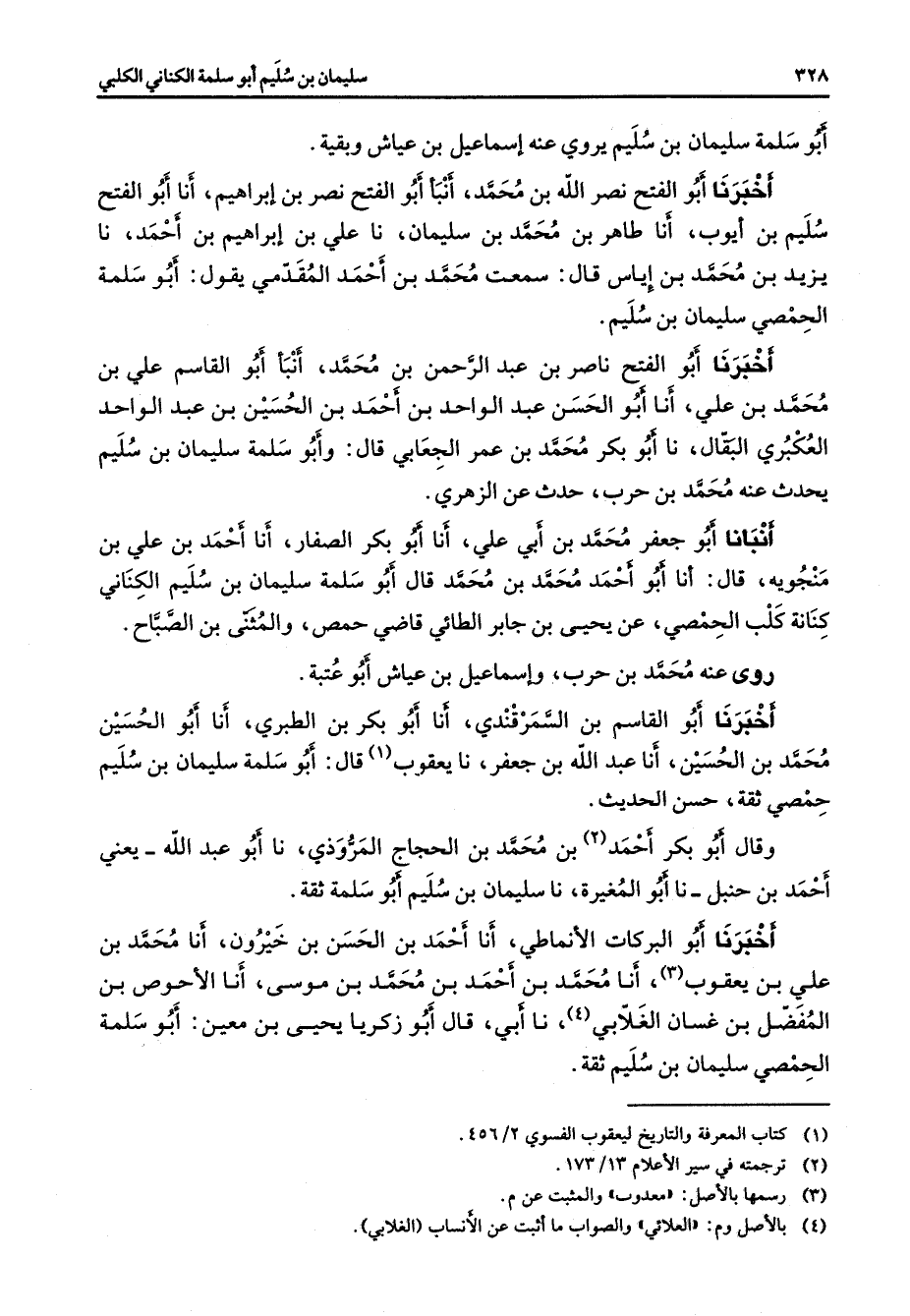 أبو سلمة سليمان بن سليم يروي عنه إسماعيل بن عياش وبقية أخبرنا أبو الفتح نصرالله بن محمد أنبأ أبو الفتح نصر بن إبراهيم أنا أبو الفتح سليم بن أيوب أنا طاهر بن محمد بن سليمان نا علي بن إبراهيم بن أحمد نا يزيد بن محمد بن إياس قال سمعت محمد بن أحمد المقدمي يقول أبو سلمة الحمصي سليمان بن سليم أخبرنا أبو الفتح ناصر بن عبد الرحمن بن محمد أنبأ أبو القاسم علي بن محمد بن علي أنا أبو الحسن عبد الواحد بن أحمد بن الحسين بن عبد الواحد العكبري البقال نا أبو بكر محمد بن عمر الجعابي قال وأبو سلمة سليمان بن سليم يحدث عنه محمد بن حرب حدث عن الزهري أنبأنا أبو جعفر محمد بن أبي علي أنا أبو بكر الصفار أنا أحمد بن علي بن منجوية قال أنا أبو أحمد محمد بن محمد قال أبو سلمة سليمان بن سليم الكناني كنانة كلب الحمصي عن يحيى بن جابر الطائي قاضي حمص والمثنى بن الصباح روى عنه محمد بن حرب وإسماعيل بن عياش أبو عتبة أخبرنا أبو القاسم بن السمرقندي أنا أبو بكر بن الطبري أنا أبو الحسين محمد بن الحسين أنا عبد الله بن جعفر نا يعقوب (1) قال أبو سلمة سليمان بن سليم حمصي ثقة حسن الحديث وقال أبو بكر أحمد (2) بن محمد بن الحجاج المروذي نا أبو عبد الله يعني أحمد بن حنبل نا أبو المغيرة نا سليمان بن سليم أبو سلمة ثقة أخبرنا أبو البركات الأنماطي أنا أحمد بن الحسن بن خيرون أنا محمد بن علي بن يعقوب (3) أنا محمد بن أحمد بن محمد بن موسى أنا الأحوص بن المفضل بن غسان الغلابي (4) نا أبي قال أبو زكريا يحيى بن معين أبو سلمة الحمصي سليمان بن سليم ثقة