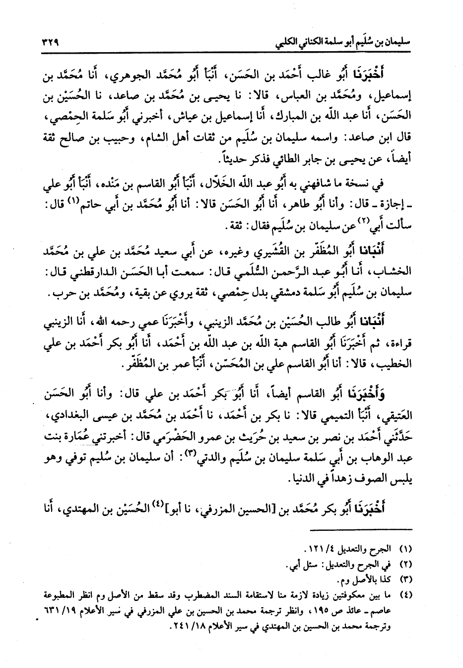 (4) ما بين معكوفتين زيادة لازمة منا لاستقامة السند المضطرب وقد سقط من الاصل وم انظر المطبوعة عاصم - عائذ ص 195، وانظر ترجمة محمد بن الحسين بن علي المزرقي في سير الاعلام 19 / 631