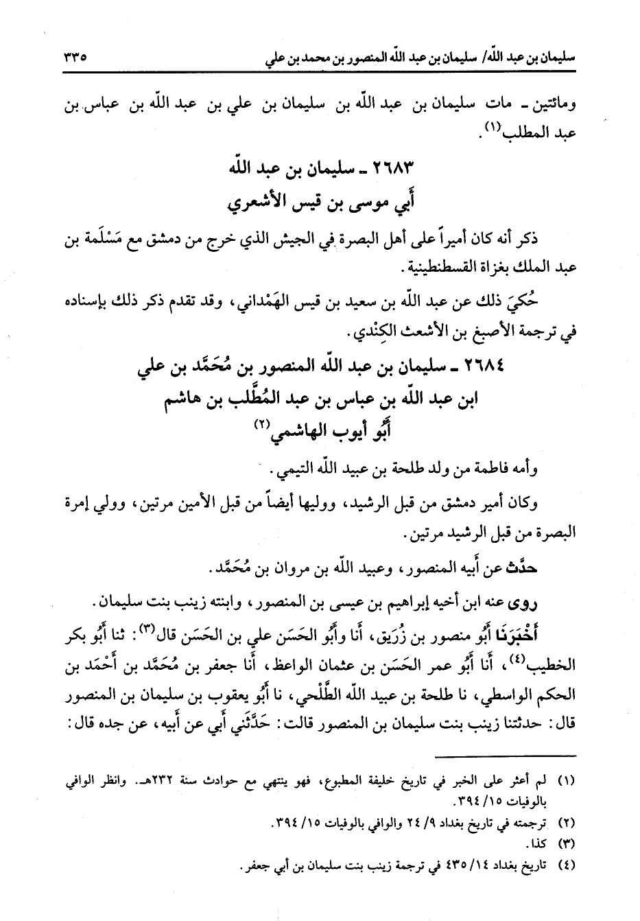 2684 - سليمان بن عبد الله المنصور بن محمد بن علي ابن عبد الله بن عباس بن عبد المطلب بن هاشم أبو أيوب الهاشمي (2) وأمه فاطمة من ولد طلحة بن عبيد الله التيمي وكان أمير دمشق من قبل الرشيد ووليها أيضا من قبل الأمين مرتين وولي إمرة البصرة من قبل الرشيد مرتين حدث عن أبيه المنصور وعبيد الله بن مروان بن محمد روى عنه ابن أخيه إبراهيم بن عيسى بن المنصور وابنته زينب بنت سليمان أخبرنا أبو منصور بن زريق أنا وأبو الحسن علي بن الحسن قال (3) : ثنا أبو بكر الخطيب (4) أنا أبو عمر الحسن بن عثمان الواعظ أنا جعفر بن محمد بن أحمد بن الحكم الواسطي نا طلحة بن عبيد الله الطلحي نا أبو يعقوب بن سليمان بن المنصور قال حدثتنا زينب بنت سليمان بن المنصور قالت حدثني أبي عن أبيه عن جده قال