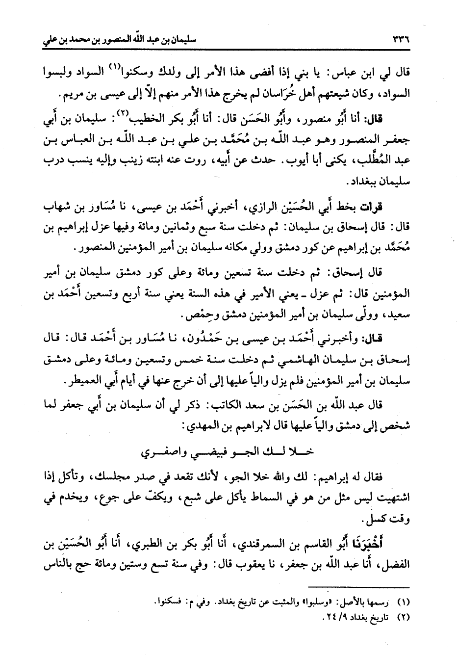 قال لي ابن عباس يا بني إذا أفضى هذا الأمر إلى ولدك وسكنوا (1) السواد ولبسوا السواد وكان شيعتهم أهل خراسان لم يخرج هذا الأمر منهم إلا إلى عيسى بن مريم قال أنا أبو منصور وأبو الحسن قال أنا أبو بكر الخطيب (2) سليمان بن أبي جعفر المنصور وهو عبد الله بن محمد بن علي بن عبد الله بن العباس بن عبد المطلب يكنى أبا أيوب حدث عن أبيه روت عنه ابنته زينب وإليه ينسب درب سليمان ببغداد قرأت بخط أبي الحسين الرازي أخبرني أحمد بن عيسى نا مساور بن شهاب قال قال إسحاق بن سليمان ثم دخلت سنة سبع وثمانين ومائة وفيها عزل إبراهيم بن محمد بن إبراهيم عن كور دمشق وولي مكانه سليمان بن أمير المؤمنين المنصور قال إسحاق ثم دخلت سنة تسعين ومائة وعلى كور دمشق سليمان بن أمير المؤمنين قال ثم عزل يعني الأمير في هذه السنة يعني سنة أربع وتسعين أحمد بن سعيد وولى سليمان بن أمير المؤمنين دمشق وحمص قال وأخبرني أحمد بن عيسى بن حمدون نا مساور بن أحمد قال قال إسحاق بن سليمان الهاشمي ثم دخلت سنة خمس وتسعين ومائة وعلى دمشق سليمان بن أمير المؤمنين فلم يزل واليا عليها إلى أن خرج عنها في أيام أبي العميطر قال عبد الله بن الحسن بن سعد الكاتب ذكر لي أن سليمان بن أبي جعفر لما شخص إلى دمشق واليا عليها قال لابراهيم بن المهدي خلالك الجو فبيضي واصفري فقال له إبراهيم لك والله خلا الجو لأنك تقعد في صدر مجلسك وتأكل إذا اشتهيت ليس مثل من هو في السماط يأكل على شبع ويكف على جوع ويخدم في وقت كسل أخبرنا أبو القاسم بن السمرقندي أنا أبو بكر بن الطبري أنا أبو الحسين بن الفضل أنا عبد الله بن جعفر نا يعقوب قال وفي سنة تسع وستين ومائة حج بالناس