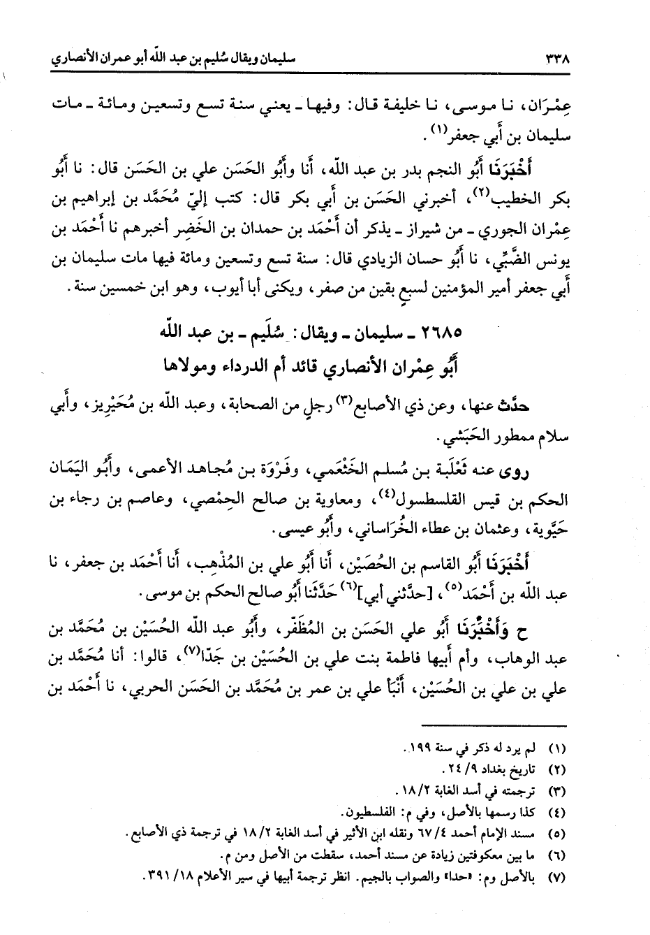 2685 - سليمان ويقال سليم بن عبد الله أبو عمران الأنصاري قائد أم الدرداء ومولاها حدث عنها وعن ذي الأصابع (3) رجل من الصحابة وعبد الله بن محيريز وأبي سلام ممطور ممطور الحبشي روى عنه ثعلبة بن مسلم الخثعمي وفروة بن مجاهد الأعمى وأبو اليمان الحكم بن قيس القلسطسول (4) ومعاوية بن صالح الحمصي وعاصم بن رجاء بن حيوية وعثمان بن عطاء الخراساني وأبو عيسى أخبرنا أبو القاسم بن الحصين أنا أبو علي بن المذهب أنا أحمد بن جعفر نا عبد الله بن أحمد (5) حدثني أبي (6) حدثنا أبو صالح الحكم بن موسى ح وأخبرنا أبو علي الحسن بن المظفر وأبو عبد الله الحسين بن محمد بن عبد الوهاب وأم أبيها فاطمة بنت علي بن الحسين بن جدا (7) قالوا أنا محمد بن علي بن علي بن الحسين أنبأ علي بن عمر بن محمد بن الحسن الحربي نا أحمد بن