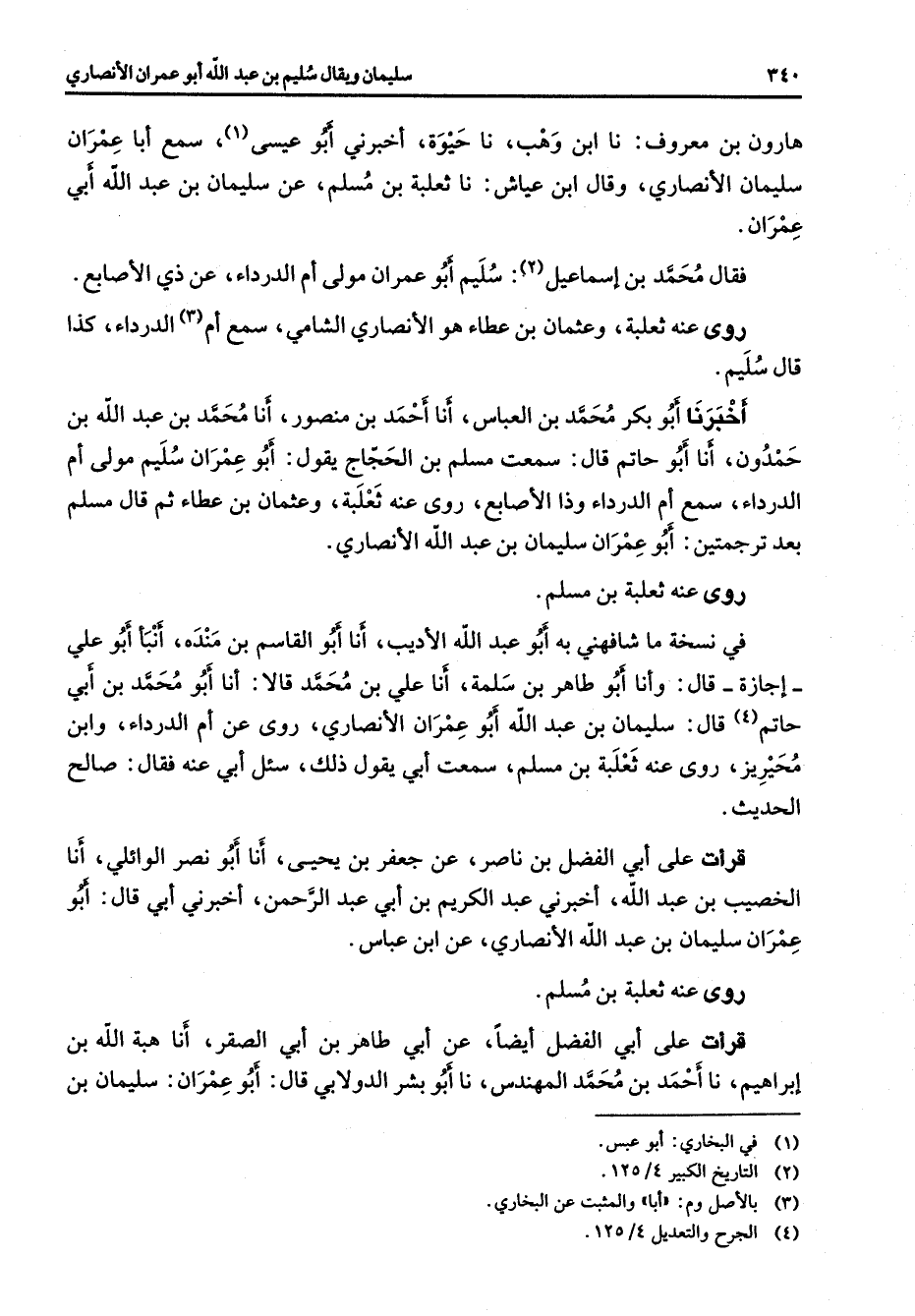 هارون بن معروف نا ابن وهب نا حيوة أخبرني أبو عيسى (1) سمع أبا عمران سليمان الأنصاري وقال ابن عياش نا ثعلبة بن مسلم عن سليمان بن عبد الله أبي عمران فقال محمد بن إسماعيل (2) : سليم أبو عمران مولى أم الدرداء عن ذي الأصابع روى عنه ثعلبة وعثمان بن عطاء هو الأنصاري الشامي سمع أم (3) الدرداء كذا قال سليم أخبرنا أبو بكر محمد بن العباس أنا أحمد بن منصور أنا محمد بن عبد الله بن حمدون أنا أبو حاتم قال سمعت مسلم بن الحجاج يقول أبو عمران سليم مولى أم الدرداء سمع أم الدرداء وذا الأصابع روى عنه ثعلبة وعثمان بن عطاء ثم قال مسلم بعد ترجمتين أبوعمران بن سليمان عبد الله الأنصاري روى عنه ثعلبة بن مسلم في نسخة ما شافهني به أبو عبد الله الأديب أنا أبو القاسم بن مندة أنبأ أبو علي إجازة قال وأنا أبو طاهر بن سلمة أنا علي بن محمد قالا أنا أبو محمد بن أبي حاتم (4) قال سليمان بن عبد الله أبو عمران الأنصاري روى عن أم الدرداء وابن محيريز روى عنه ثعلبة بن مسلم سمعت أبي يقول ذلك سئل أبي عنه فقال صالح الحديث قرأت على أبي الفضل بن ناصر عن جعفر بن يحيى أنا أبو نصر الوائلي أنا الخصيب بن عبد الله أخبرني عبد الكريم بن أبي عبد الرحمن أخبرني أبي قال أبو عمران سليمان بن عبد الله الأنصاري عن ابن عباس روى عنه ثعلبة بن مسلم قرأت على أبي الفضل أيضا عن أبي طاهر بن أبي الصقر أنا هبة الله بن إبراهيم نا أحمد بن محمد المهندس نا أبو بشر الدولابي قال أبو عمران سليمان بن