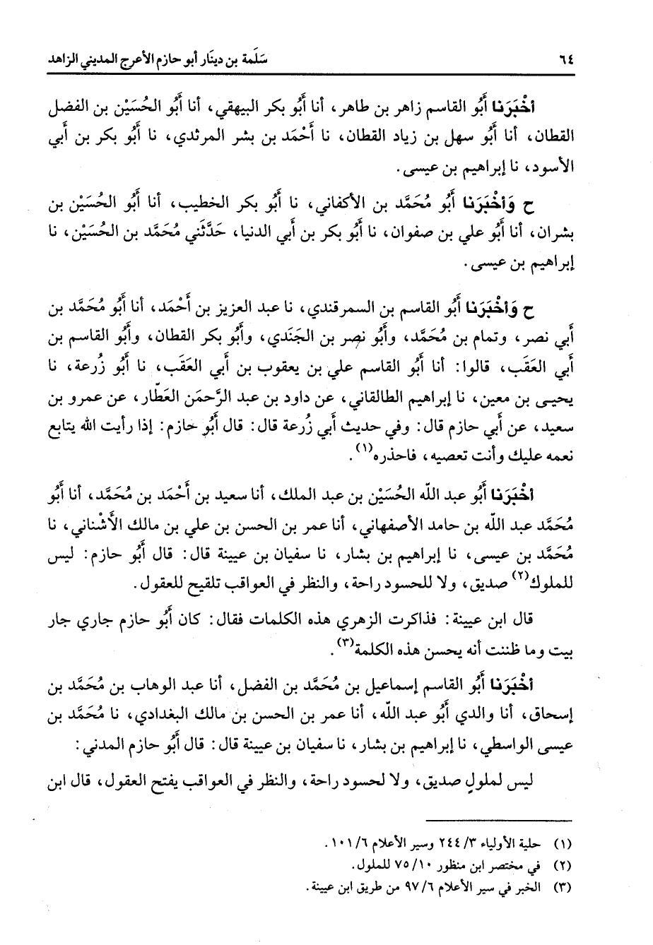 أخبرنا أبو عبد الله الحسين بن عبد الملك أنا سعيد بن أحمد بن محمد أنا أبو محمد عبد الله بن حامد الأصفهاني أنا عمر بن الحسن بن علي بن مالك الأشناني نا محمد بن عيسى نا إبراهيم بن بشار نا سفيان بن عيينة قال قال أبو حازم ليس للملوك (2) صديق ولا للحسود راحة والنظر في العواقب تلقيح للعقول قال ابن عيينة فذاكرت الزهري هذه الكلمات فقال كان أبو حازم جاري جار بيت وما ظننت أنه يحسن هذه الكلمة (3)