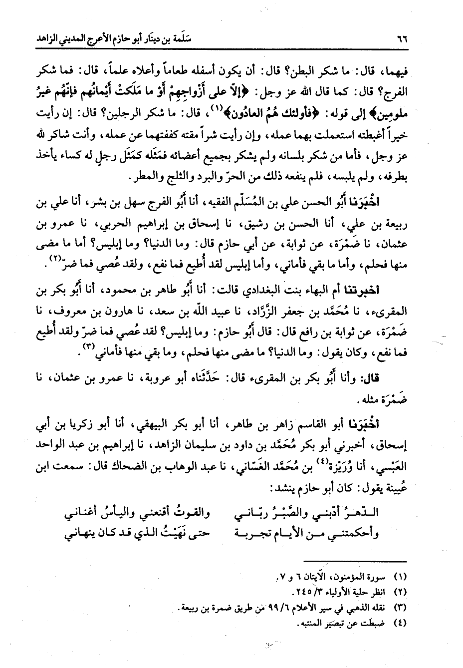 أخبرتنا أم البهاء بنت البغدادي قالت أنا أبو طاهر بن محمود أنا أبو بكر بن المقرئ نا محمد بن جعفر الزراد نا عبيد الله بن سعد نا هارون بن معروف نا ضمرة عن ثوابة بن رافع قال قال أبو حازم وما إبليس لقد عصي فما ضر ولقد أطيع فما نفع وكان يقول وما الدنيا ما مضى منها فحلم وما بقي منها فأماني (3)