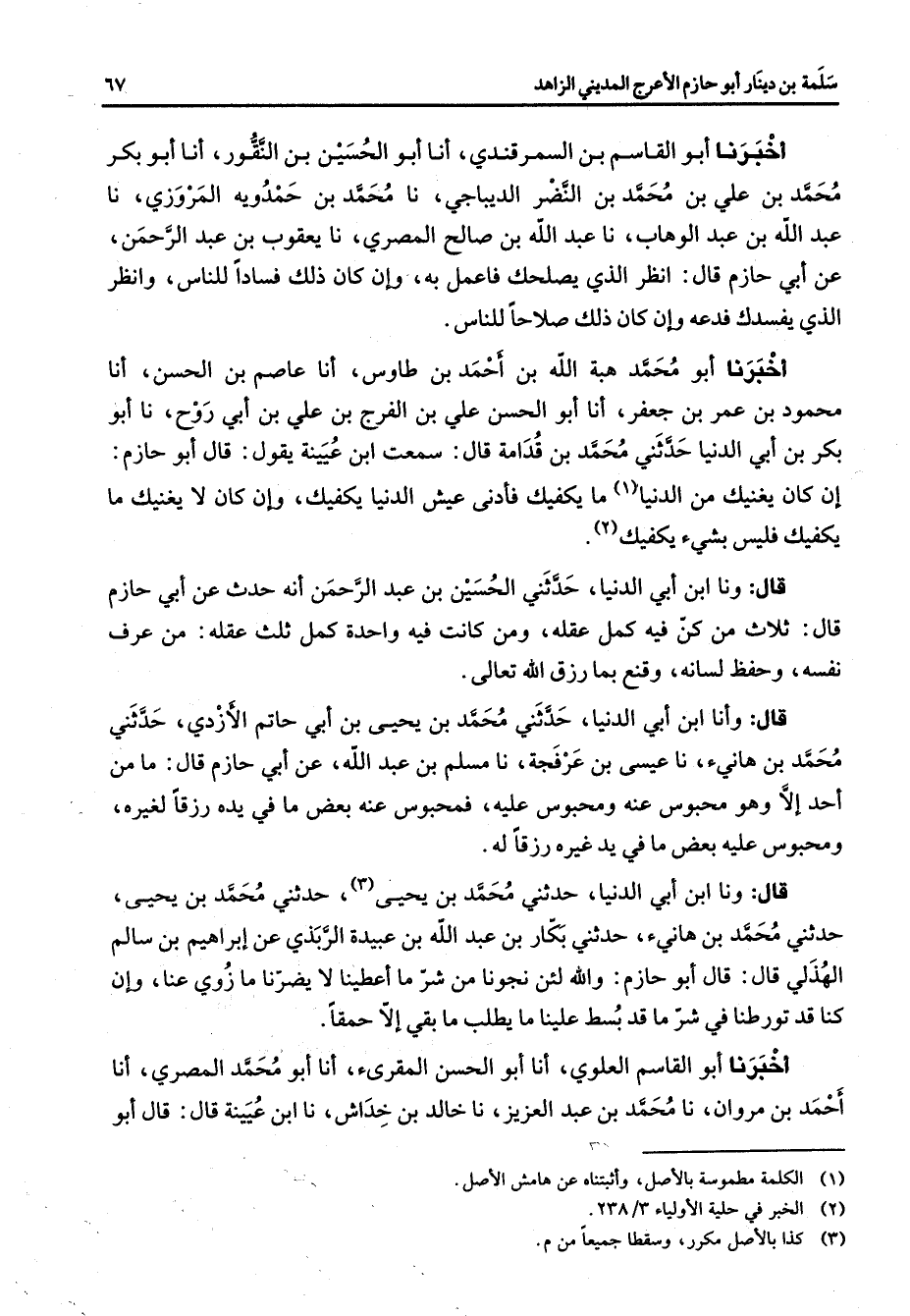 قال ونا ابن أبي الدنيا حدثني الحسين بن عبد الرحمن أنه حدث عن أبي حازم قال ثلاث من كن فيه كمل عقله ومن كانت فيه واحدة كمل ثلث عقله من عرف نفسه وحفظ لسانه وقنع بما رزق الله تعالى قال وأنا ابن أبي الدنيا حدثني محمد بن يحيى بن أبي حاتم الأزدي حدثني محمد بن هانئ نا عيسى بن عرفجة نا مسلم بن عبد الله عن أبي حازم قال ما من أحد إلا وهو محبوس عنه ومحبوس عليه فمحبوس عنه بعض ما في يده رزقا لغيره ومحبوس عليه بعض ما في يد غيره رزقا له قال ونا ابن أبي الدنيا حدثني محمد بن يحيى حدثني محمد بن يحيى (3) حدثني محمد بن هانئ حدثني بكار بن عبد الله بن عبيدة الربذي عن إبراهيم بن سالم الهذلي قال قال أبو حازم والله لئن نجونا من شر ما أعطينا لا يضرنا ما زوي عنا وإن كنا قد تورطنا في شر ما قد بسط علينا ما يطلب ما بقي إلا حمقا أخبرنا أبو القاسم العلوي أنا أبو الحسن المقرئ أنا أبو محمد المصري أنا أحمد بن مروان نا محمد بن عبد العزيز نا خالد بن خداش نا ابن عيينة قال قال أبو